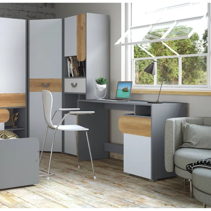 Atutem tego biurka jest duży blat roboczy, który znacząco wpływa na jakość wykonywanej pracy. Za drzwiczkami znajduje się dodatkowa półka na dokumenty, książki lub notatki, co umożliwia zorganizowanie przestrzeni zgodnie z indywidualnymi potrzebami.