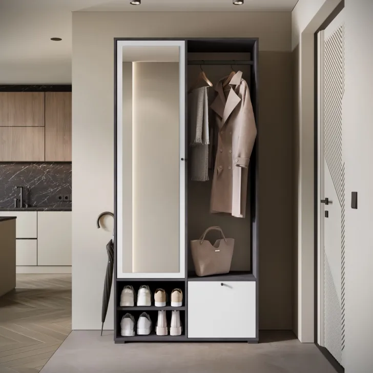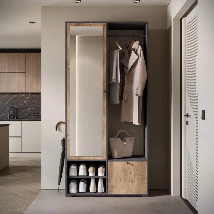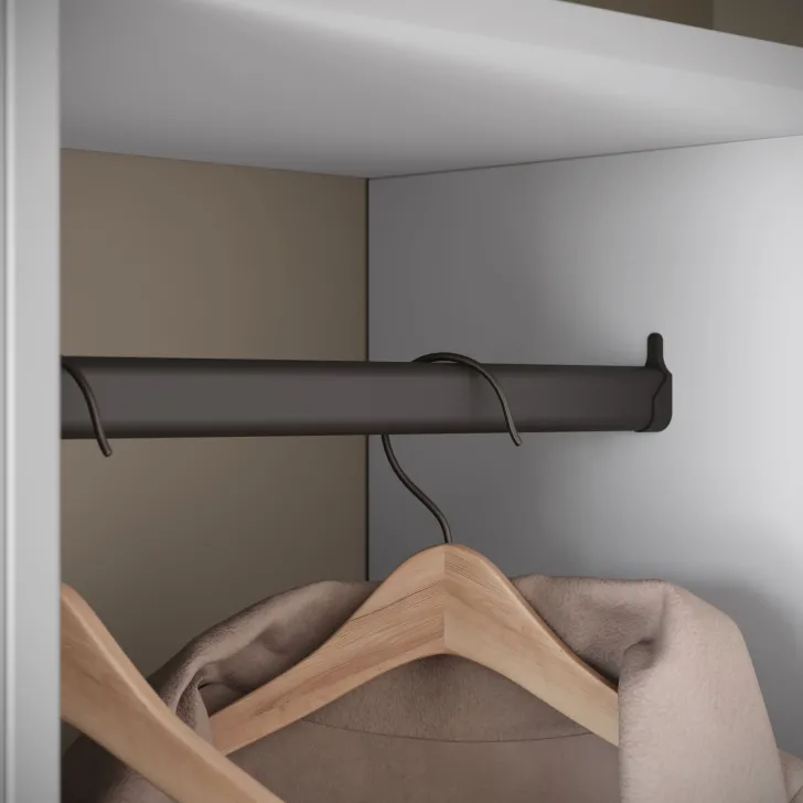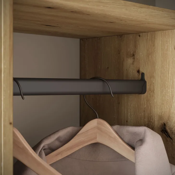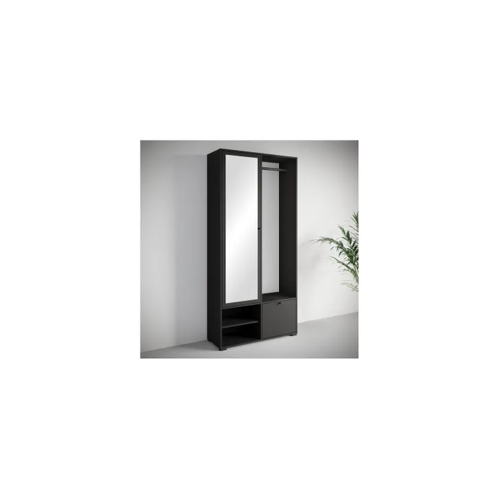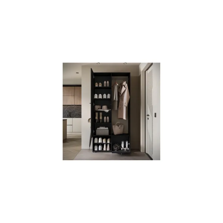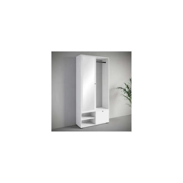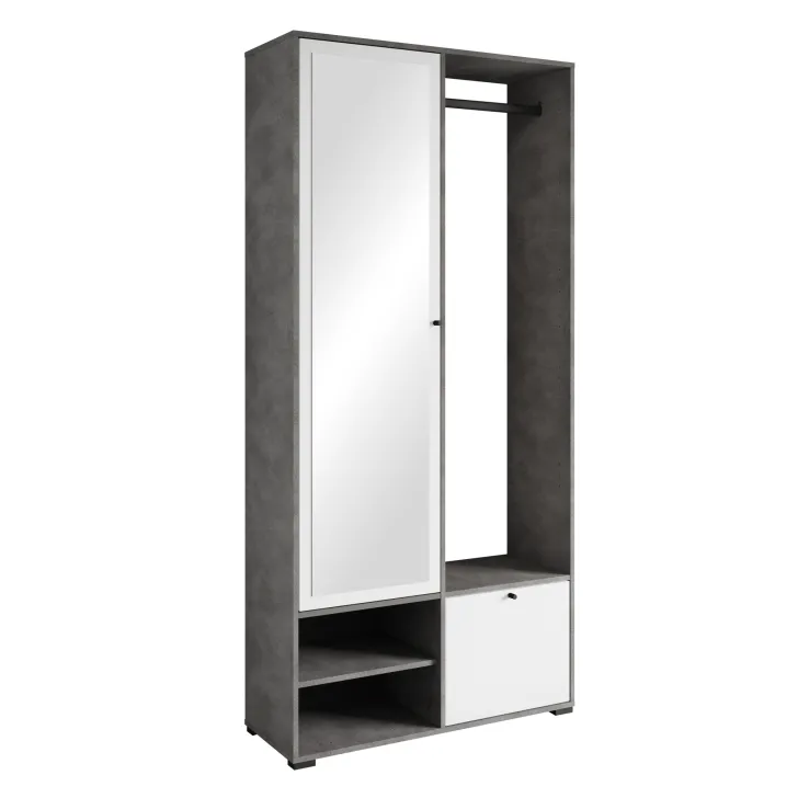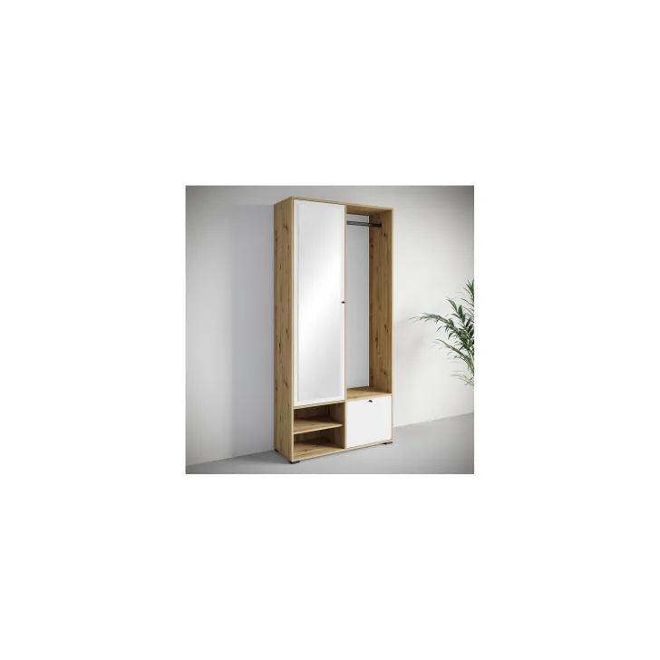 Główną część garderoby stanowi szafa z szerokimi półkami, które pomieszczą ubrania, dodatki lub dokumenty. Szafa ta wyposażona jest również w duże lustro, które optycznie powiększa pomieszczenie i pozwala sprawdzić swój wygląd przed wyjściem z domu. W skład zestawu wchodzą również: solidny metalowy drążek na ubrania, dwie otwarte wnęki oraz praktyczna szafka na buty uruchamiana za pomocą systemu klapy.