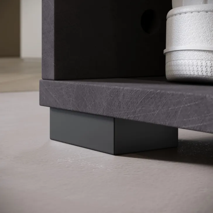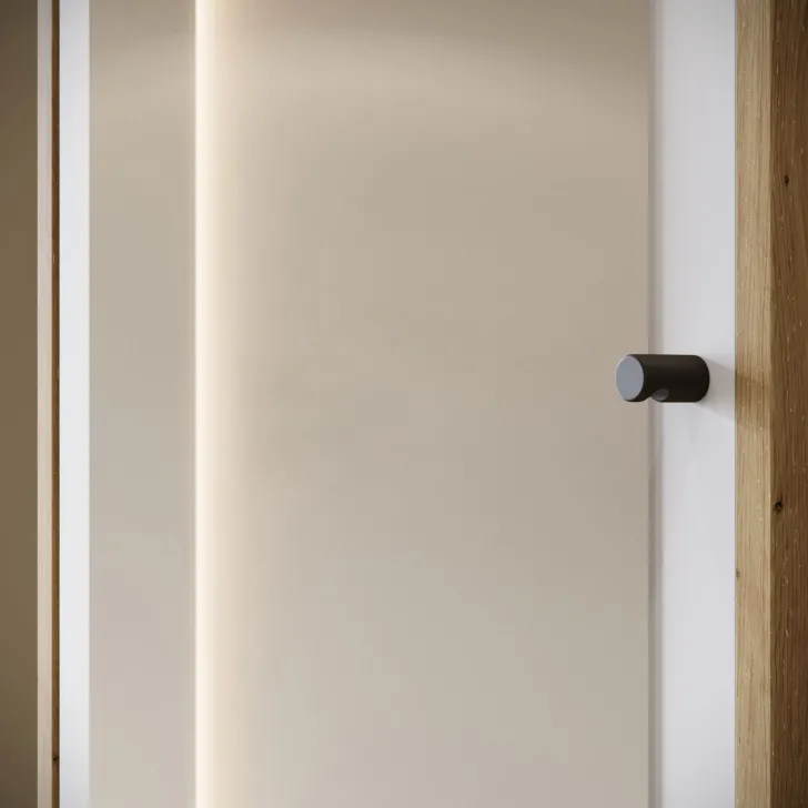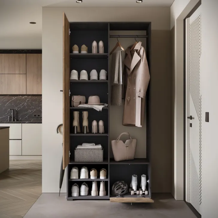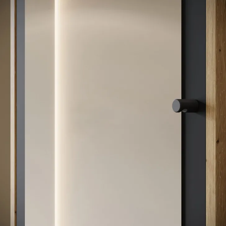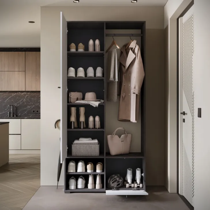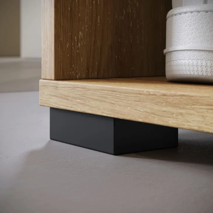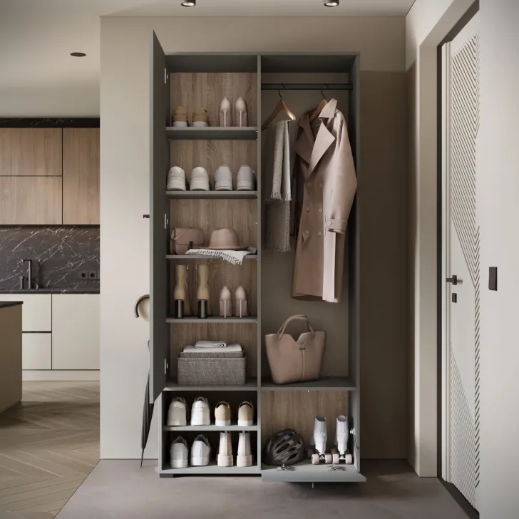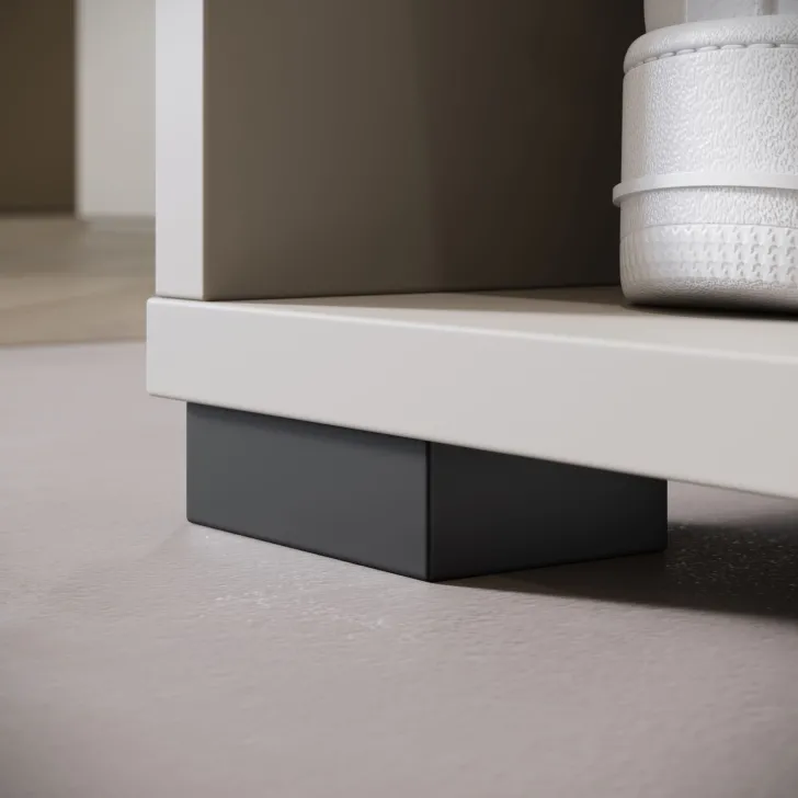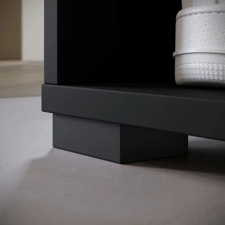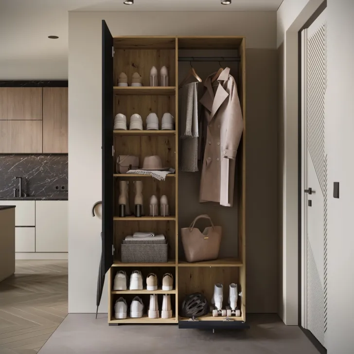 Główną część garderoby stanowi szafa z szerokimi półkami, które pomieszczą ubrania, dodatki lub dokumenty. Szafa ta wyposażona jest również w duże lustro, które optycznie powiększa pomieszczenie i pozwala sprawdzić swój wygląd przed wyjściem z domu. W skład zestawu wchodzą również: solidny metalowy drążek na ubrania, dwie otwarte wnęki oraz praktyczna szafka na buty uruchamiana za pomocą systemu klapy.
