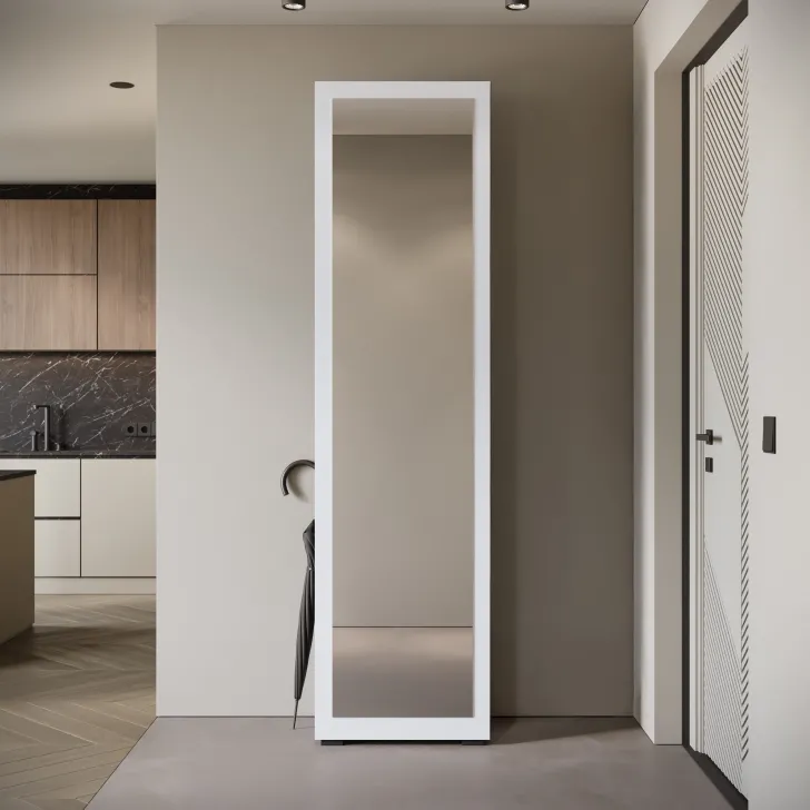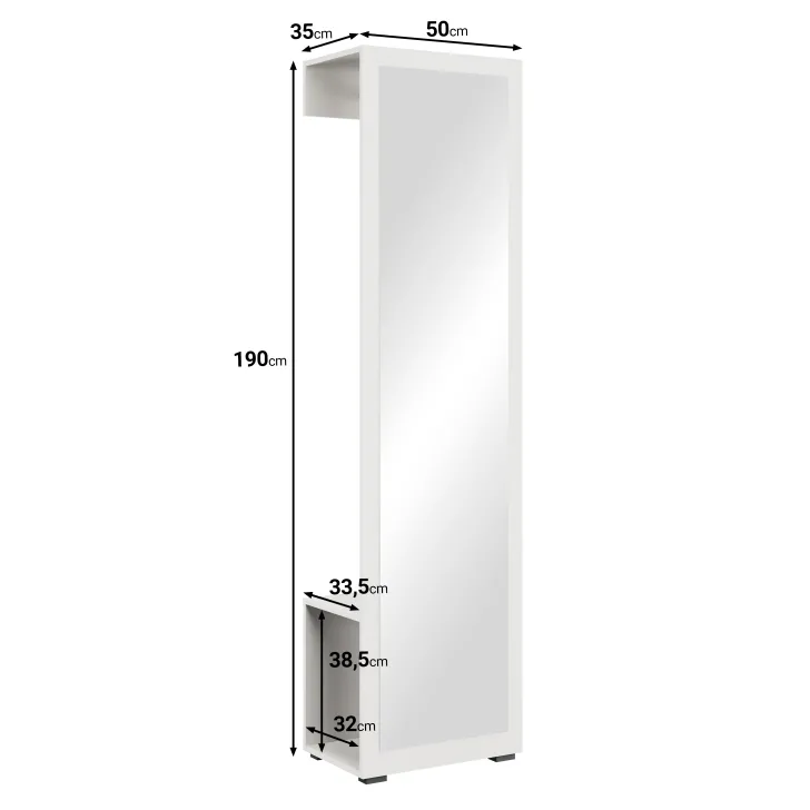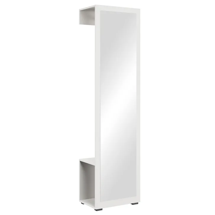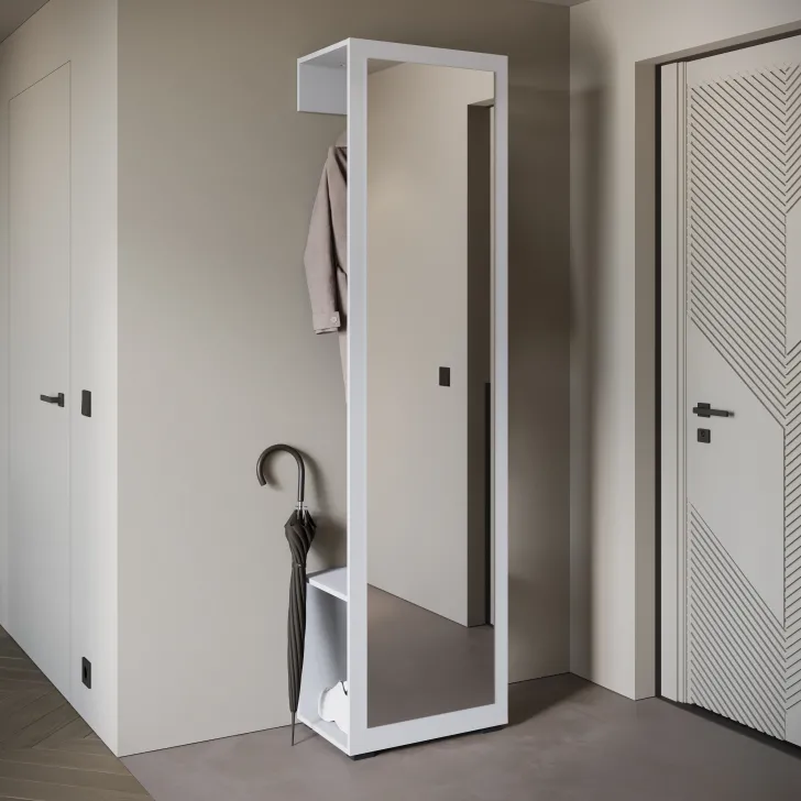 Duże lustro nie tylko pełni praktyczną funkcję, ale również odbija światło optycznie rozjaśniając i powiększając przestrzeń pomieszczenia. Za lustrem znajduje się drążek na okrycia wierzchnie, a zlokalizowana w dolnej części otwarta półka będzie doskonałym miejscem na odłożenie obuwia.