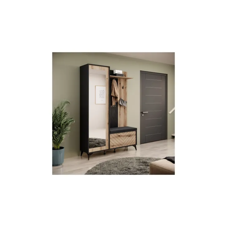 Garderoba "DIAMOND" 134 cm, z lustrem i tapicerowanym siedziskiem, kolor dąb Evoke / czarny