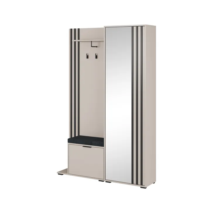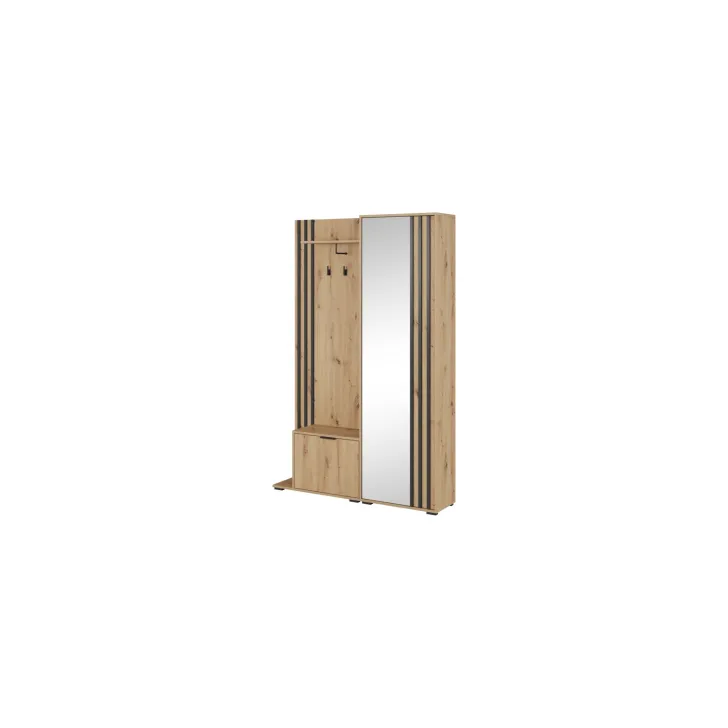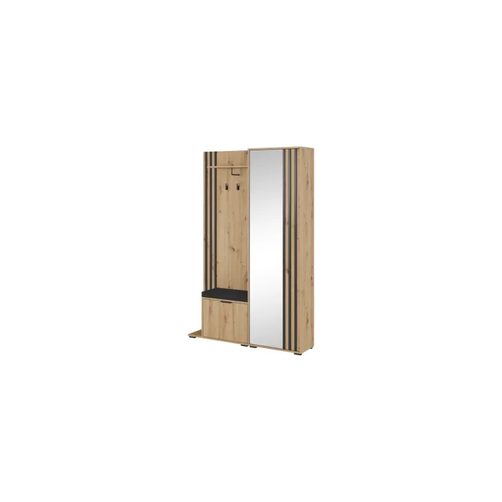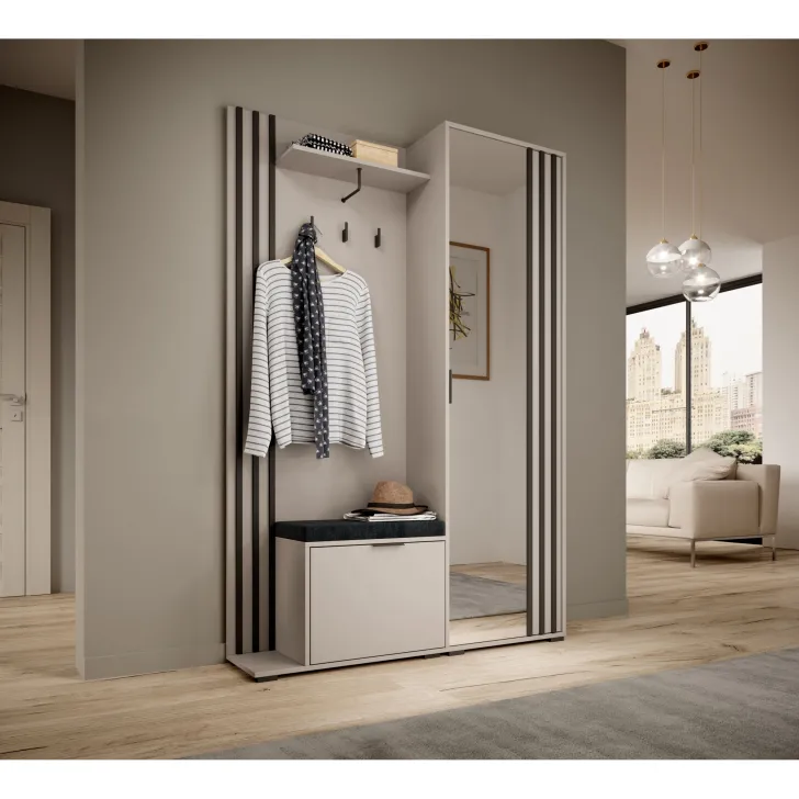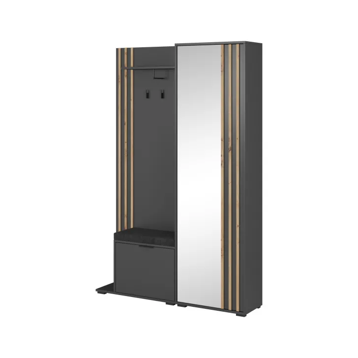 Przedstawiamy wyjątkową Garderobę "Nelly" o szerokości 105 cm. To wyrafinowany mebel do przedpokoju, utrzymany w modnym stylu loft, który doda uroku Twojemu wnętrzu. Zaletą jest duże lustro w całości ułatwiające sprawdzenie swojego wyglądu. Garderoba jest dostępna w czterech atrakcyjnych kolorach (dąb artisan, grafit, biały, kaszmir) z kontrastującymi czarnymi dodatkami. Plotki mówią, że może stać się jednym z hitów tegorocznej jesieni. Diamentem w koronie jest eleganckie, tapicerowane siedzisko do wyboru, które sprawi, że zarówno dzieci, jak i osoby starsze będą cieszyły się komfortem podczas zakładania i zdejmowania butów. Każda sztuka garderoby wyposażona jest nie tylko w lustra, ale także w pojemne półki, praktyczne przegrody na buty oraz wieszaki na płaszcze i kurtki. To połączenie funkcjonalności z ponadczasowym stylem! Ten jeden mebel zaspokoi wszystkie Twoje potrzeby przechowywania. Twoja organizacja domu będzie na jeszcze wyższym poziomie. Sprawdź wymiary i upewnij się, że ten mebel idealnie wpasuje się w Twoje pomieszczenie: