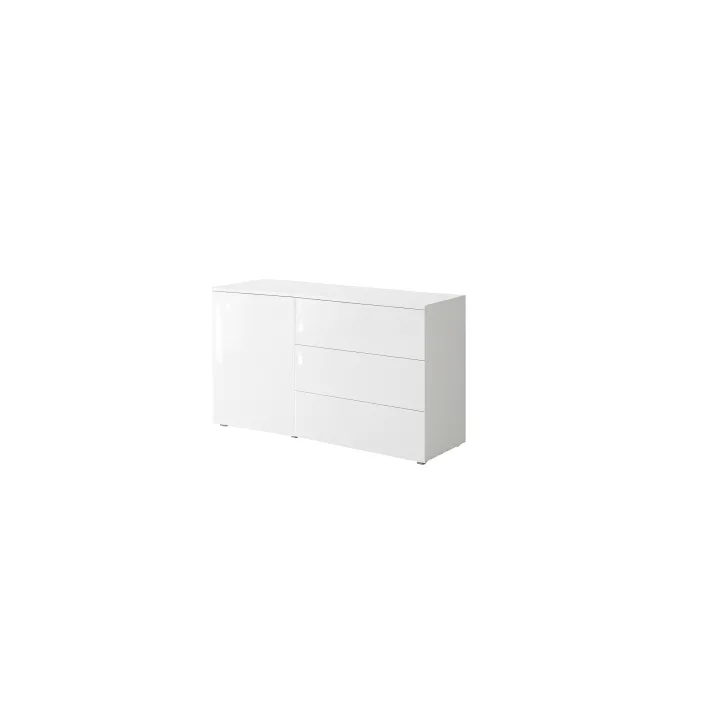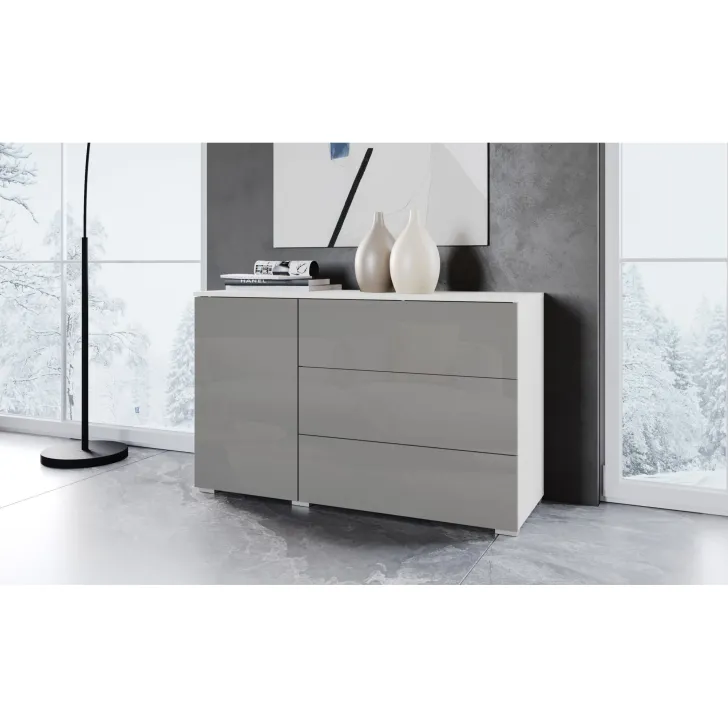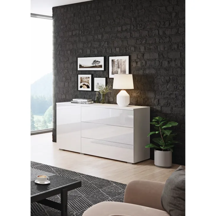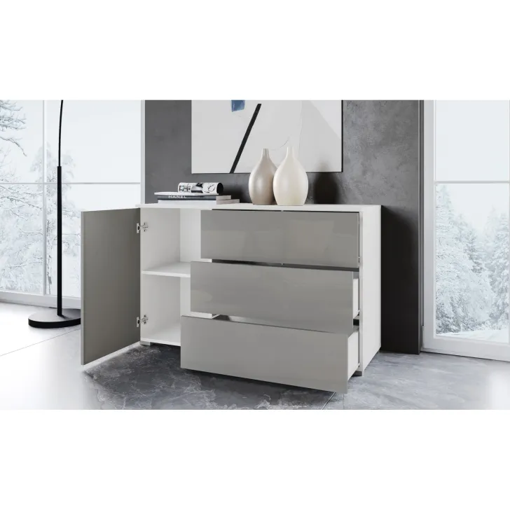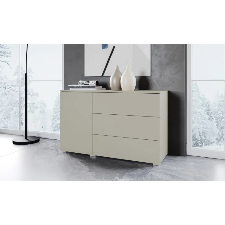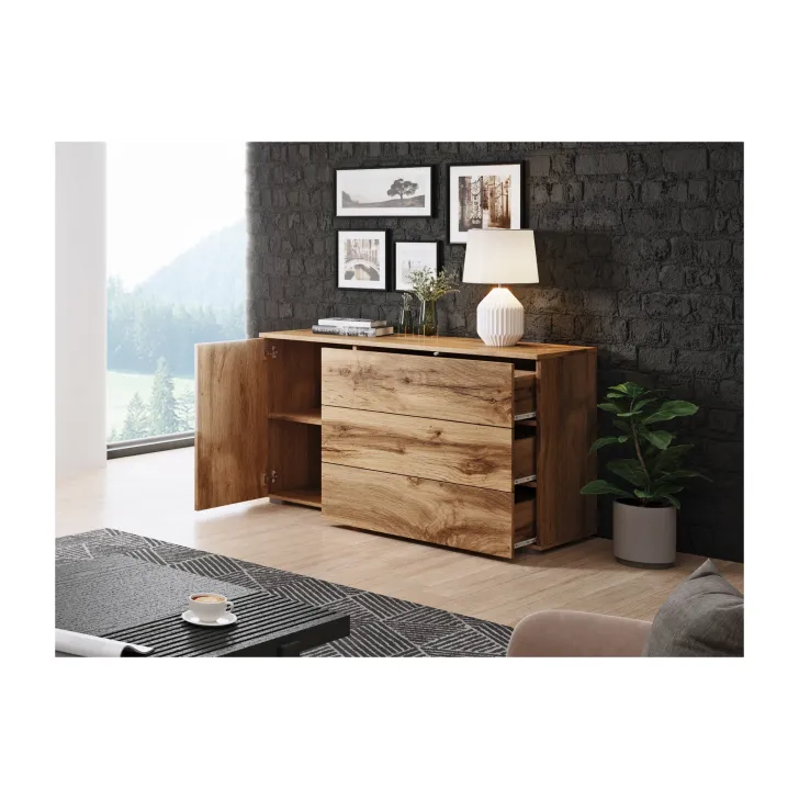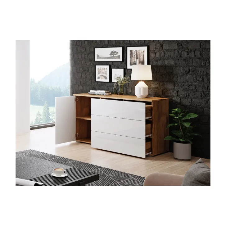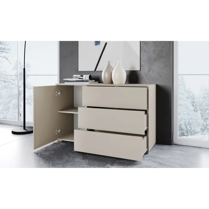 Wyjątkowym udogodnieniem jest system otwierania "Push to open", który, w połączeniu z minimalistycznym kształtem, nadaje całej konstrukcji przyjemnego dla oka, geometrycznego wyglądu. Komoda została wyposażona w zamykaną szafkę z półką, która zapewnia dodatkową przestrzeń do przechowywania, oraz w trzy szuflady, zapewniające miejsce na ulubione akcesoria czy codzienne drobiazgi.