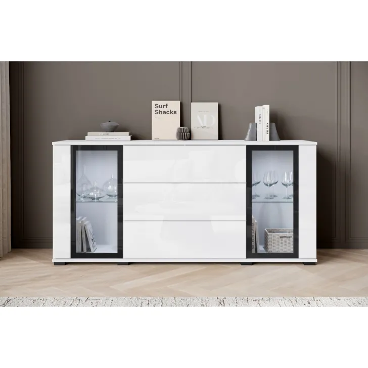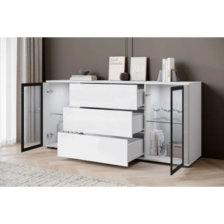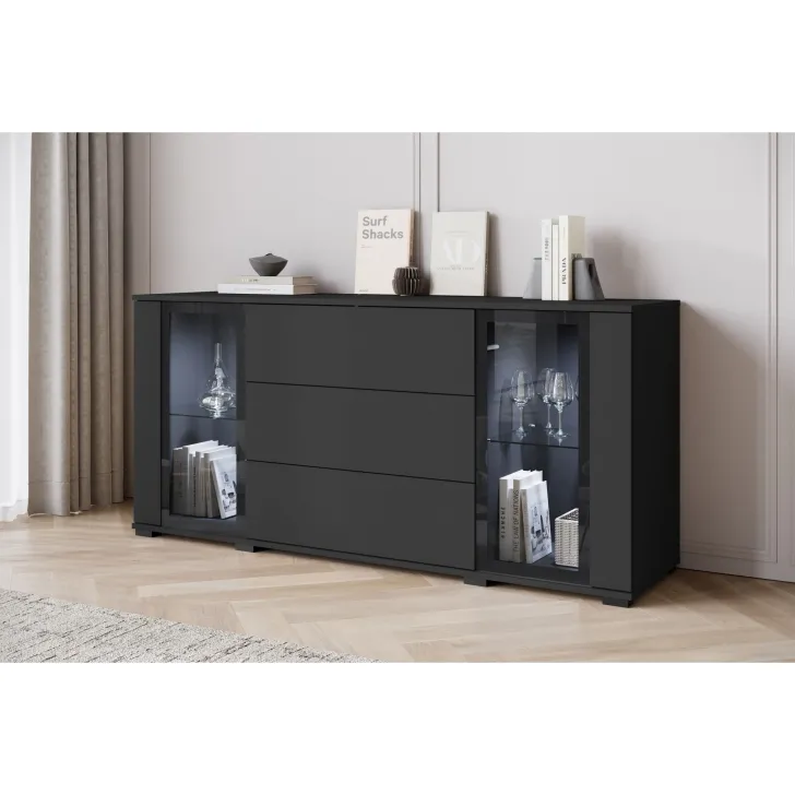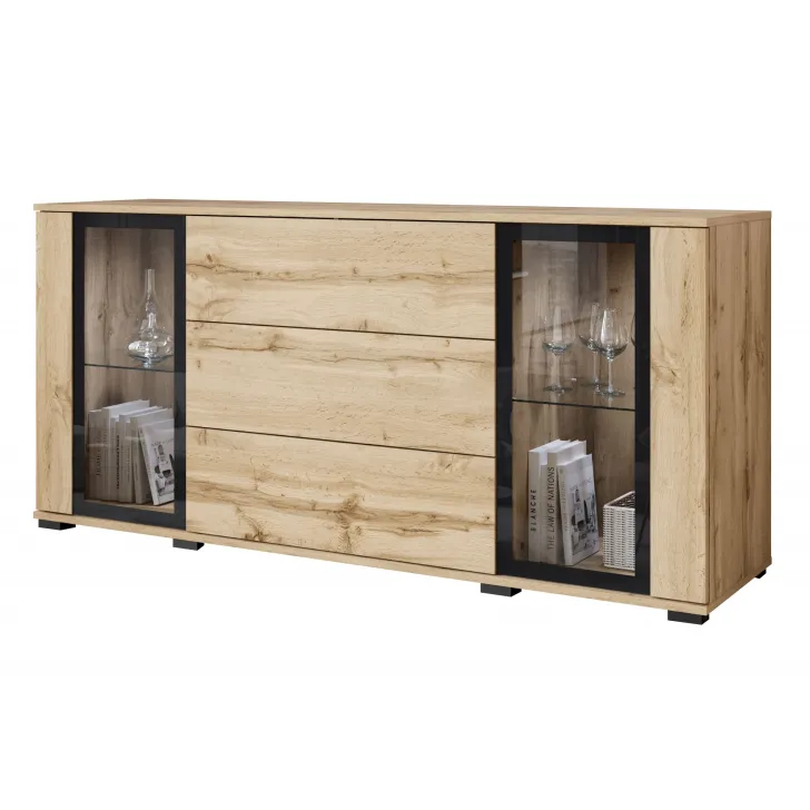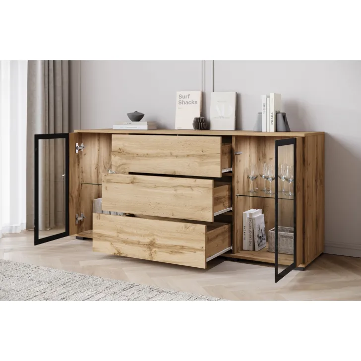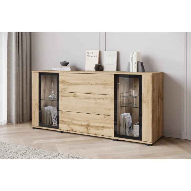 Połączenie szuflad z przeszklonymi szafkami sprawia, że ten mebel jest praktyczny i stylowy. Dzięki uniwersalnemu wyglądowi, komoda FARO 150 z łatwością dopasuje się do różnych aranżacji wnętrz, dodając klasycznym i nowoczesnym przestrzeniom dodatkowego uroku.