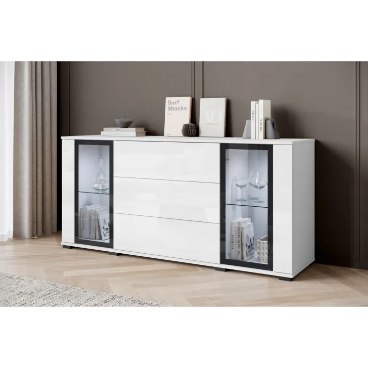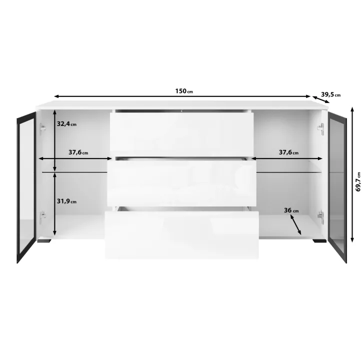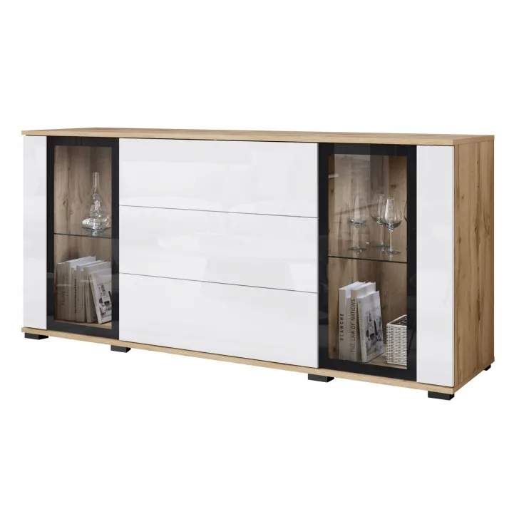 Prezentując Komodę FARO 150, oferujemy ci elegancką i nowoczesną opcję do przechowywania i eksponowania uprzedniej zawartości. Z przeszklonymi witrynami, ten mebel dodaje uroku każdemu salonowi, jadalni lub pokoju dziennemu, jednocześnie zachowując elegancję i estetykę przestrzeni. Funkcjonalny układ półek i szuflad pomaga w utrzymaniu porządku i dostarcza platformy do prezentacji książek, dekoracji czy pamiątek.