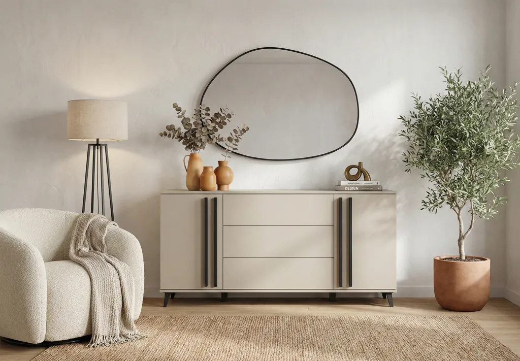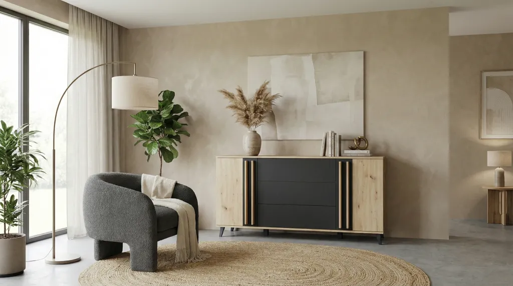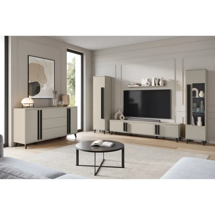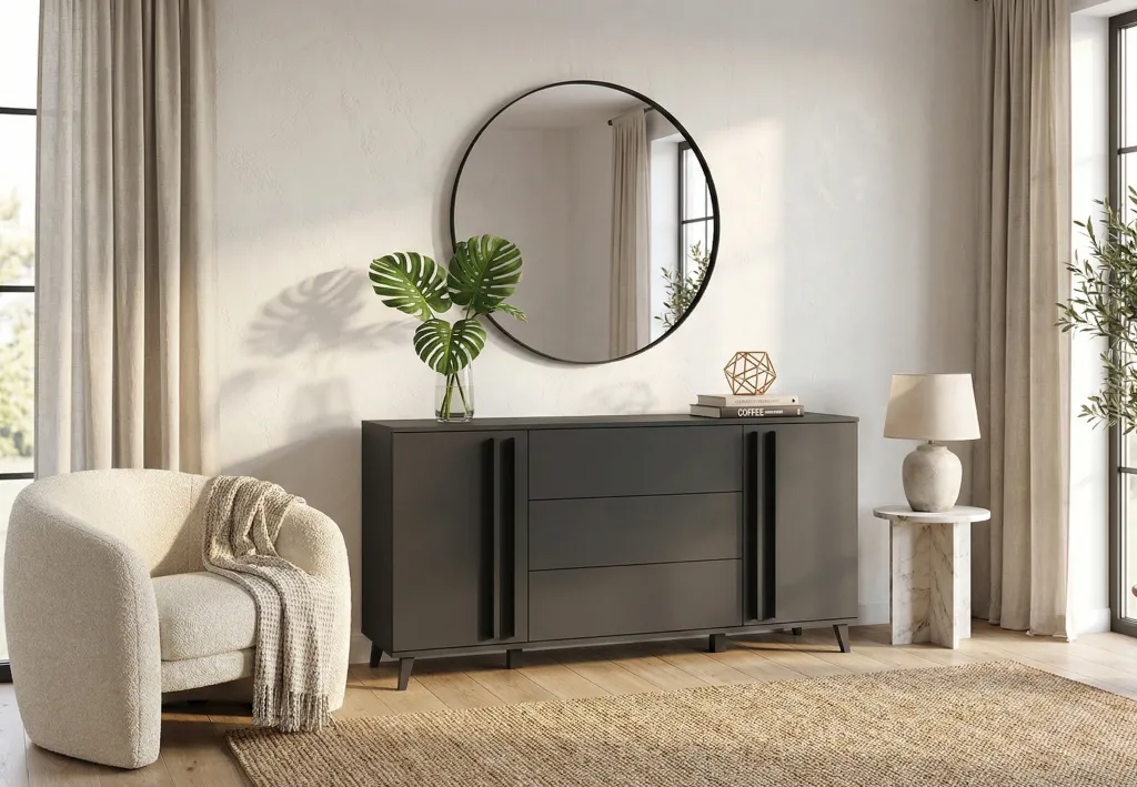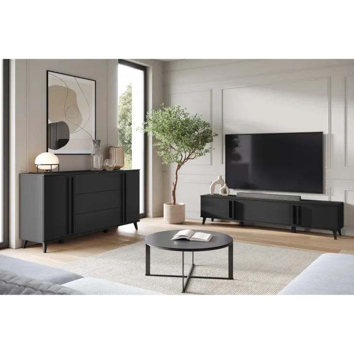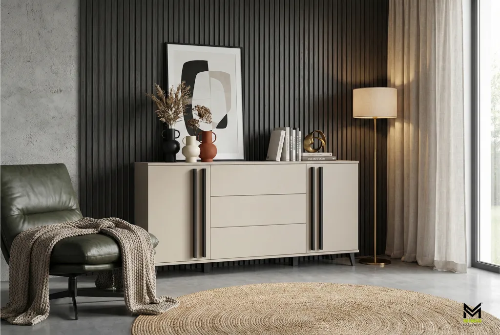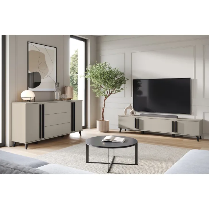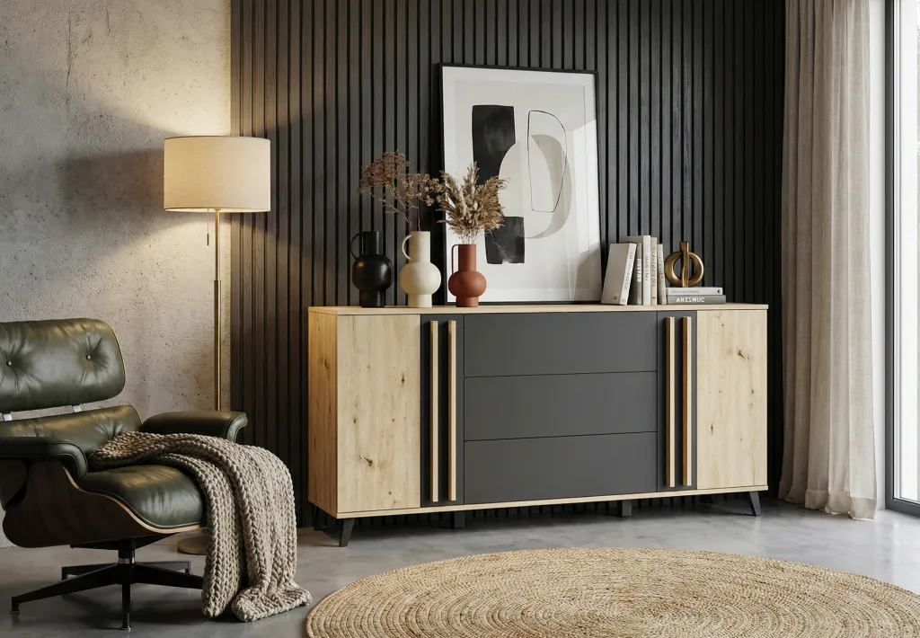 Wyrafinowany design Komody HURON odzwierciedla nowoczesne podejście do aranżacji wnętrz. Geometryczna bryła łatwo dopasowuje się do różnych stylów wnętrzarskich, sprawiając go doskonałym wyborem dla tych, którzy poszukują mebla z charakterem. Automatyczny system otwierania push to open w szufladach oraz drzwi z lamelowymi uchwytami, dodają meblowi finezyjnej lekkości.