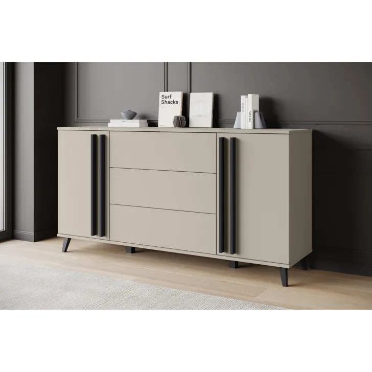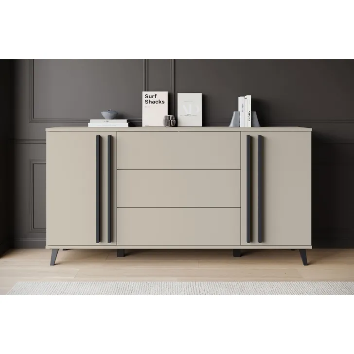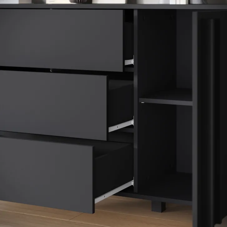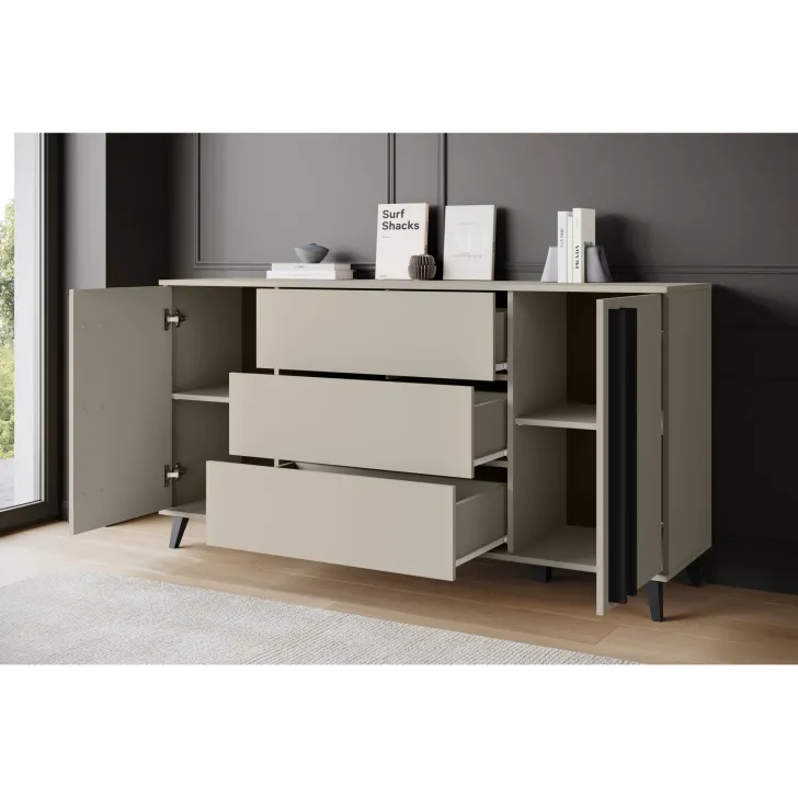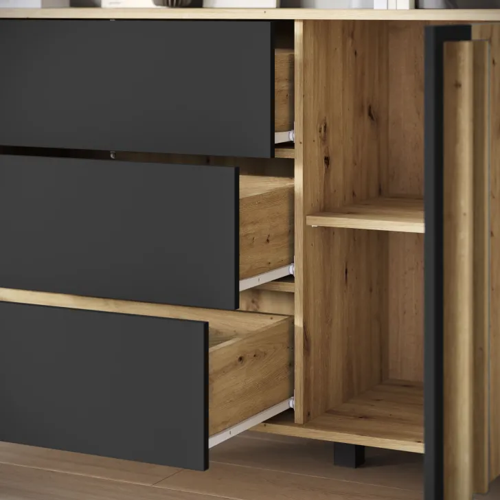 Komoda HURON gwarantuje wyjątkową funkcjonalność dzięki przemyślanemu układowi szafek i szuflad. Dwie przestronne szafki z półkami zapewniają obfitość miejsca na przechowywanie większych przedmiotów, takich jak dokumenty, albumy czy książki. Trzy szuflady, wyposażone w system otwierania push to open, są idealne do przechowywania drobiazgów. Komoda pomaga zorganizować przestrzeń, łatwo dostosowując się do Twoich codziennych potrzeb.
