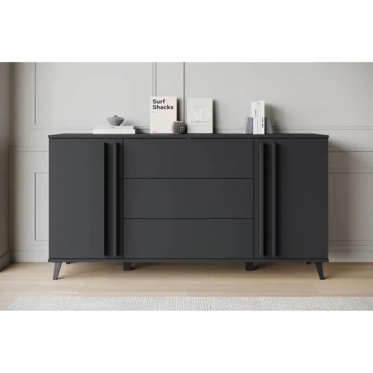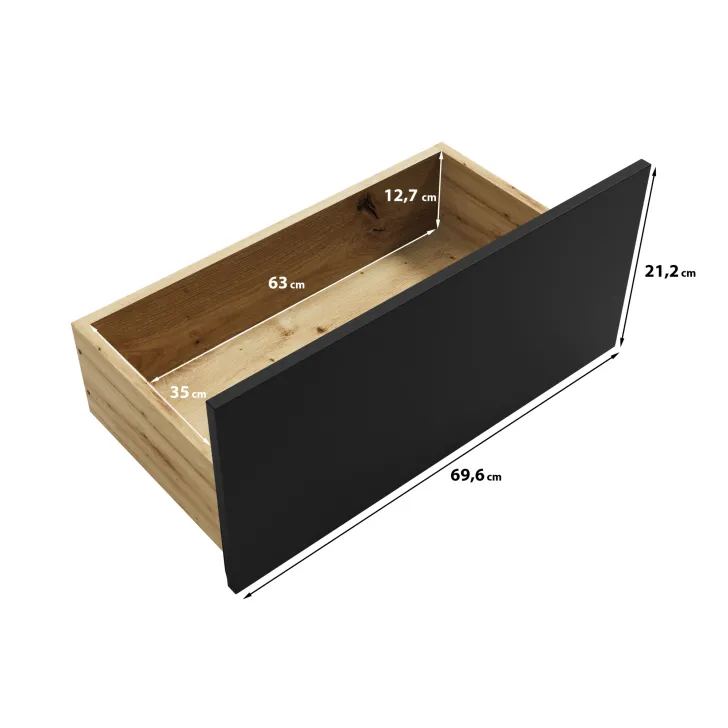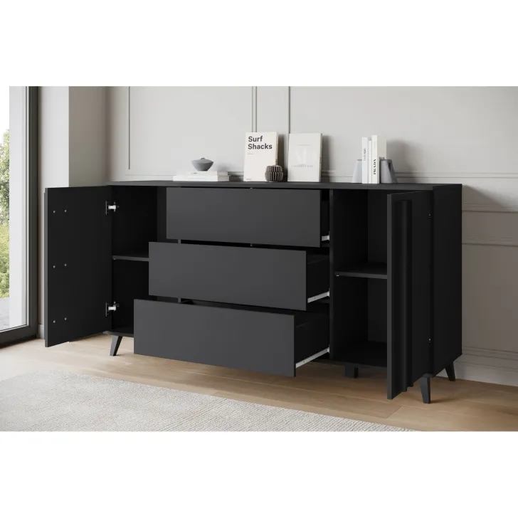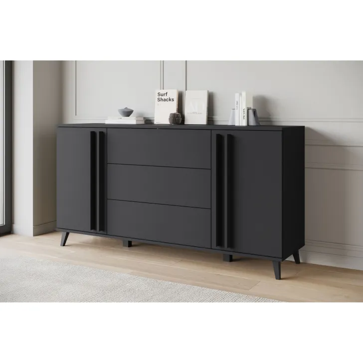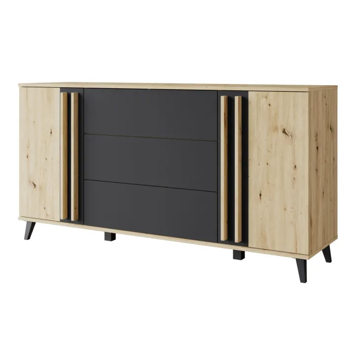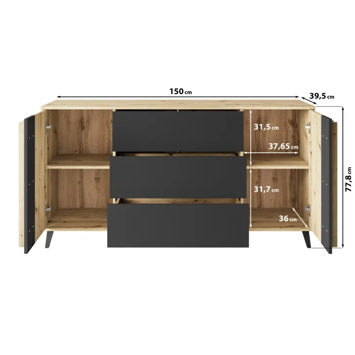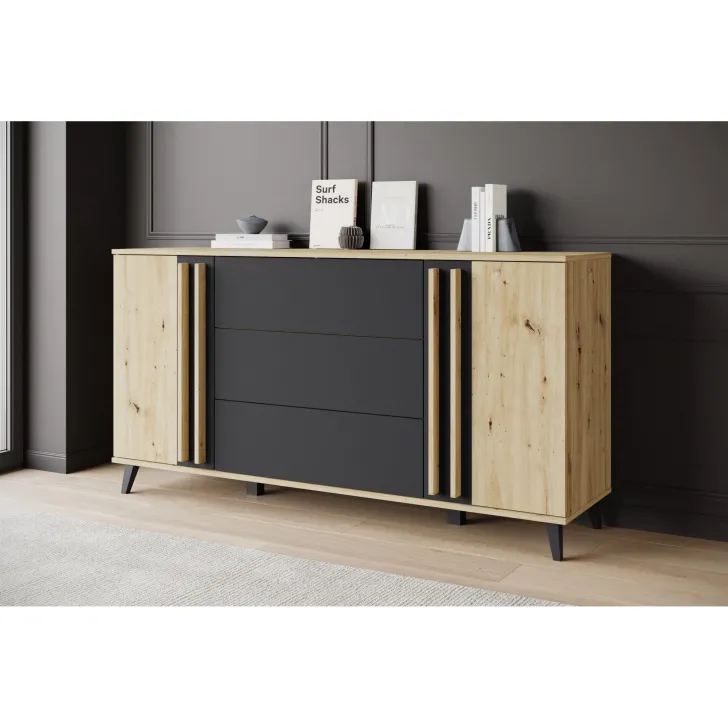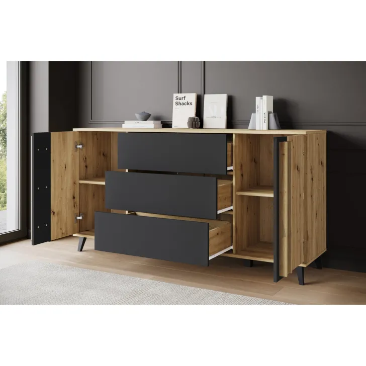 Wykonana z wysokiej jakości płyty laminowanej o grubości 15 mm, z krawędziami pokrytymi obrzeżem ABS 0,5 mm, Komoda HURON jest równie solidna, co stylowa. Jej stabilne nóżki z tworzywa sztucznego zapewniają bezpieczne i stabilne podparcie. Oferujemy trzy warianty kolorystyczne - czarny, congo/czarny oraz dąb artisan/czarny- które można dostosować do każdego wnętrza.