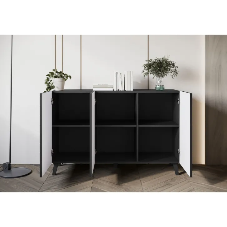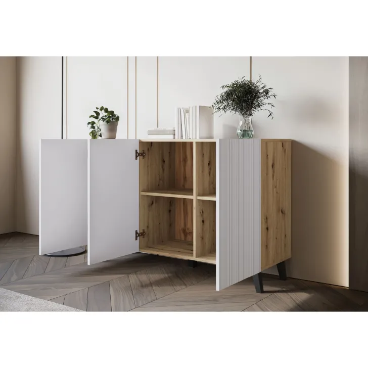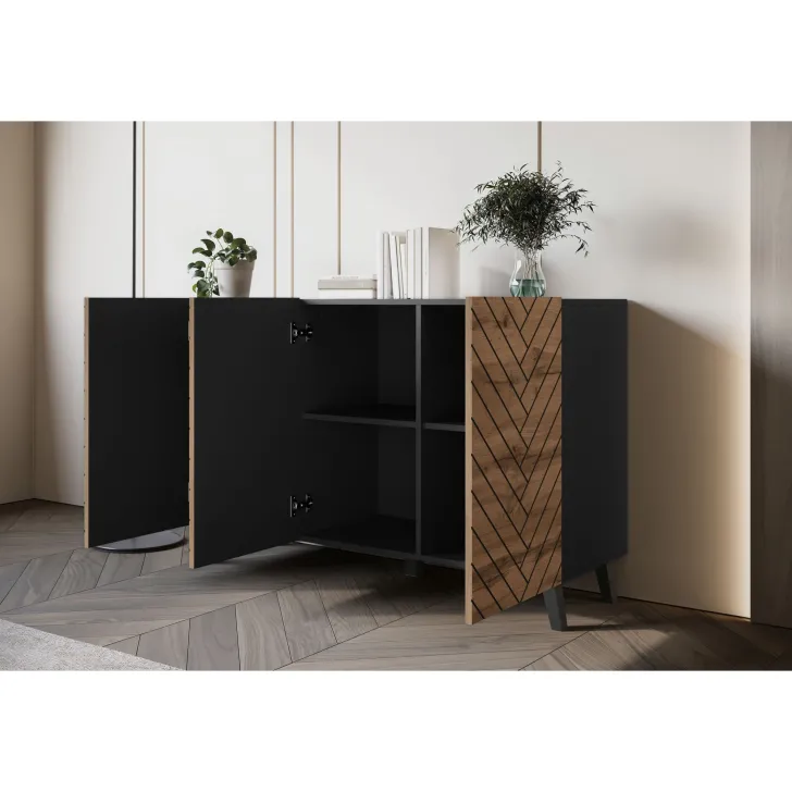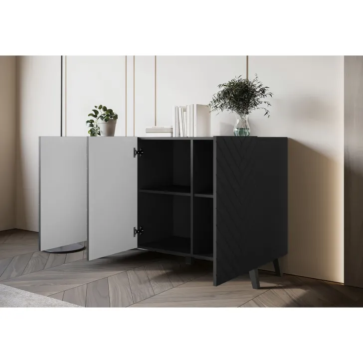 Komody w wybarwieniu : czarny z wzorem jodełka; czarny/dąb wota z wzorem jodełka; biały z wzorem ryflowanie pionowe, proste; dąb artisan/biały  z wzorem ryflowanie pionowe, slim posiadają nóżki w kolorze czarnym, fronty otwierane za pomocą chwytu za krawędź wystającą poza obrys bryły.