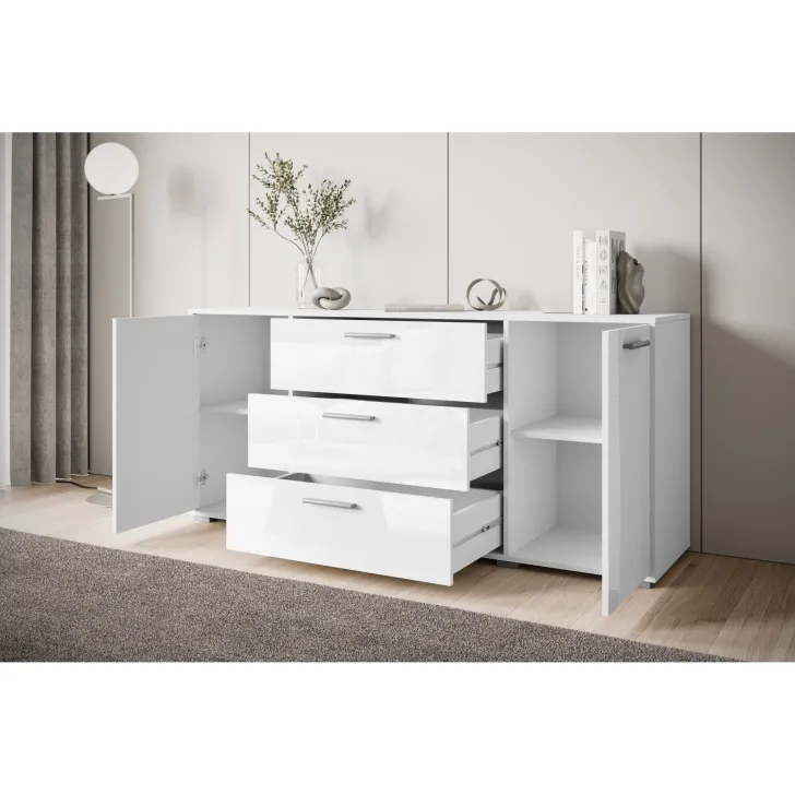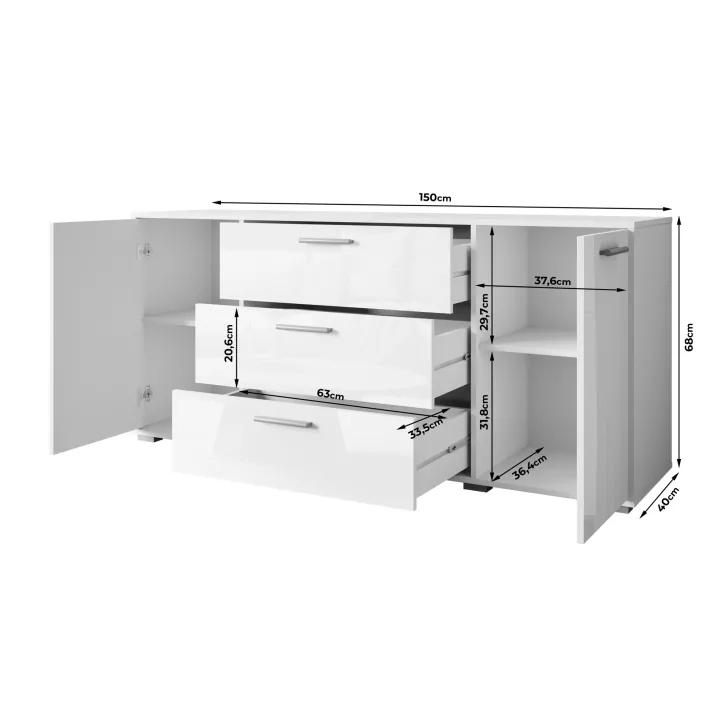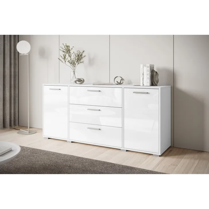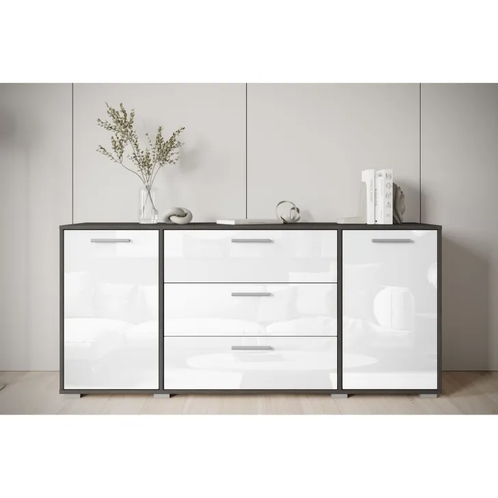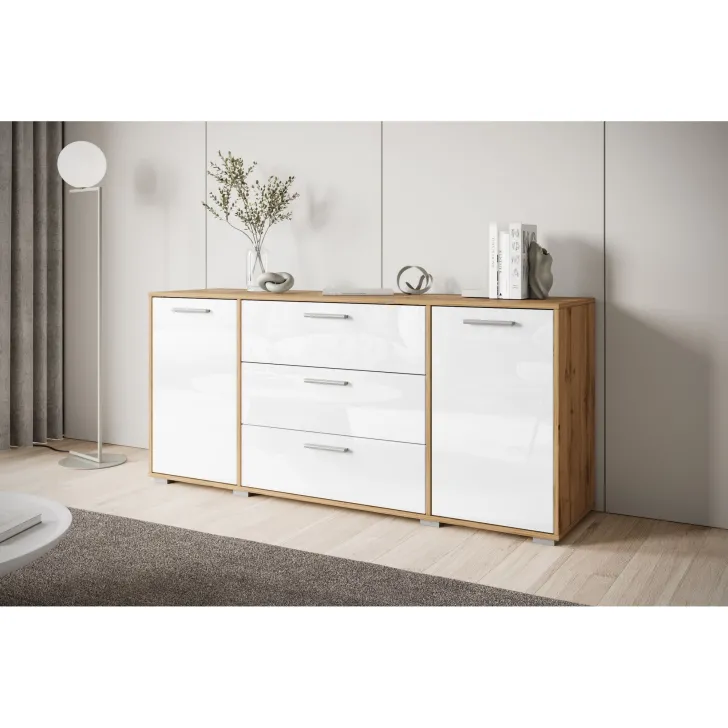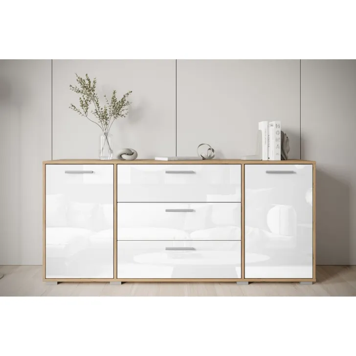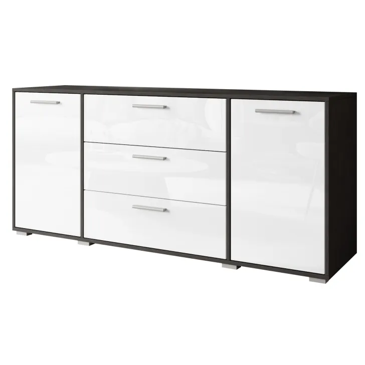 Komoda dostępna jest w kolorach Dąb wotan/czarne krawędzie, Dąb wotan/biały połysk, Biały/biały połysk, Matera/biały połysk.