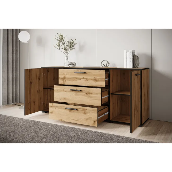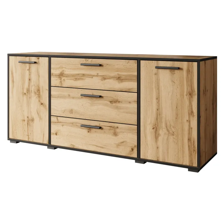 Komoda TOGA pozwala utworzyć praktyczne rozwiązanie do przechowywania potrzebnego asortymentu w każdym pomieszczeniu. Za dwojgiem drzwi kryją się regulowane półki, które dzielą wnętrze na dowolne fragmenty. Komoda posiada także trzy przestronne szuflady, zapewniające dodatkową powierzchnię do organizacji i przechowywania różnych przedmiotów. Blat komody może służyć jako miejsce do prezentowania ulubionych dekoracji czy upominków.