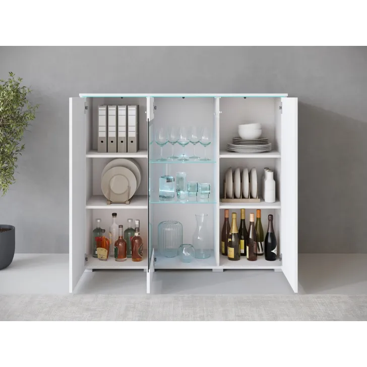 Pośrodku mebla znajduje się część przeszklona umożliwiająca wyeksponowanie ulubionych przedmiotów. Boczne szafki wyposażone w pełne fronty drzwi zaś, dzielą praktyczne półki. To idealne miejsce na przechowanie wszystkiego, co chcemy mieć pod ręką, a jednocześnie schować przed oczami gości. Dzięki temu, wszystko co przechowujesz w komodzie będzie dobrze zorganizowane i łatwo dostępne.