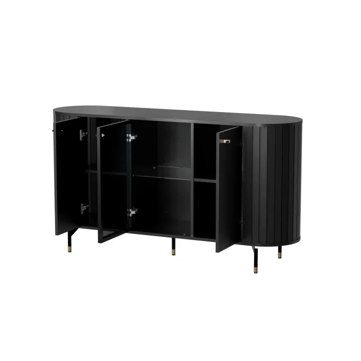Nasi projektanci zadbali o to, aby Komoda ZAMA 3 nie tylko cieszyła oko, ale była także wygodna w użytkowaniu. Fronty komody zdobią subtelne nóżki i uchwyty w kolorze czarno-złotym, które nie tylko nadają meblom lekkości, ale także podkreślają nowoczesny design. Za przeszklonymi drzwiami znajduje się szklana półka - idealna do ekspozycji Twoich ulubionych drobnych przedmiotów. Cztery schowki za pełnymi frontami drzwi zapewniają wiele miejsca do przechowywania rzeczy, umożliwiając efektywne organizowanie przestrzeni.