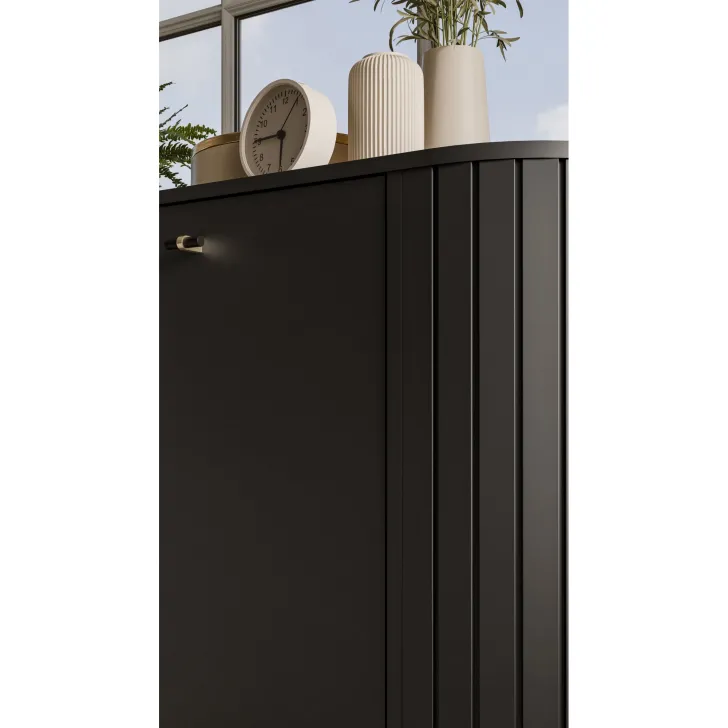 Połączenie nowoczesności z funkcjonalnością - z naciskiem na detale - to charakterystyka naszej Komody ZAMA 3. Konstrukcja mebla przyciąga wzrok zaokrąglonymi bokami, co niewątpliwie nadaje mu unikalności i wyróżnia na tle innych komód dostępnych na rynku. Zaokrąglone boki wykonane są z wysokiej jakości MDF, natomiast korpus i tył z płyty laminowanej o grubości 16 mm. Dzięki takiemu połączeniu materiałów komoda prezentuje sobą niebywały design i ogromną trwałość.