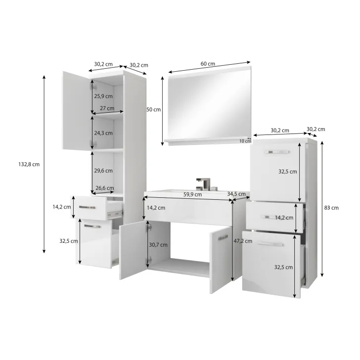 • Szafka pod umywalkę: Wys. 47,5 x Szer. 60 x Gł. 34,6 cm
