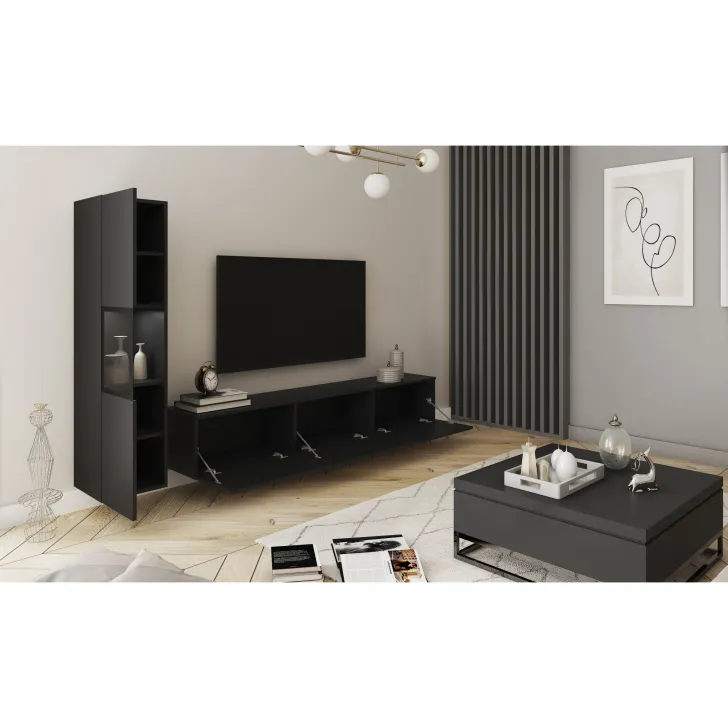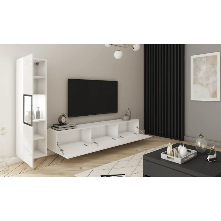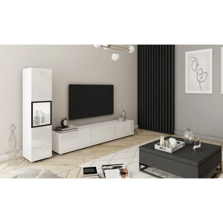 Meblościanka wykonana jest z wysokiej jakości płyty laminowanej o grubości 15 mm, a jej krawędzie oklejane są obrzeżem trwałego ABS. Spacerowicz z tworzywa sztucznego w odcieniu aluminium dodają meblowi lekkości i nowoczesnego wyglądu. W modelach z połyskiem fronty wykonane są z płyty POLYGLOSS 15 mm, a tylne ścianki z płyty HDF, dopasowane kolorem do brył. Drzwi witryny zawierają szklaną wstawkę - szkło hartowane w malowanej ramce. Opcjonalne oświetlenie LED o barwie białej dodaje uroku meblowi w wieczorne godziny.