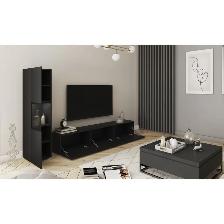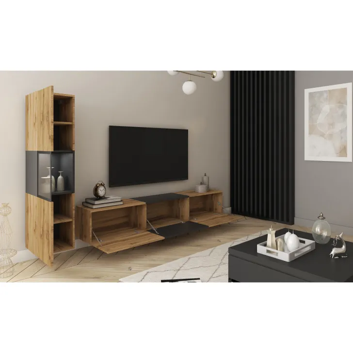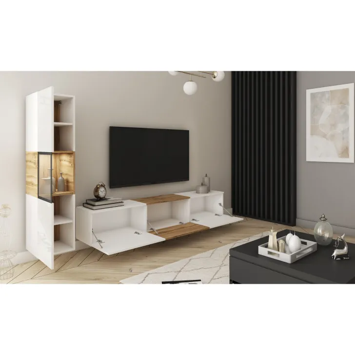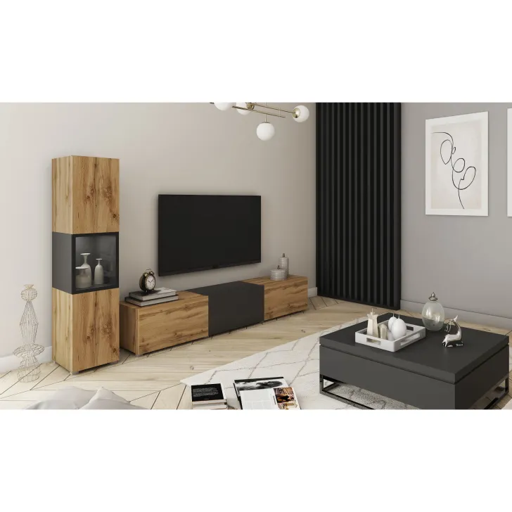 - Zróżnicowane zastosowanie: Szafka RTV wyposażona jest w trzy praktyczne schowki ukryte za drzwiami otwieranymi w systemie klap. Z kolei boczna witryna posiada półki, które pomieszczą wszystkie najpotrzebniejsze rzeczy.