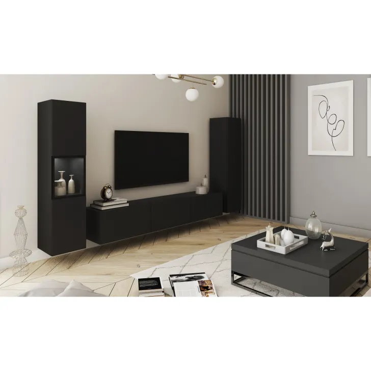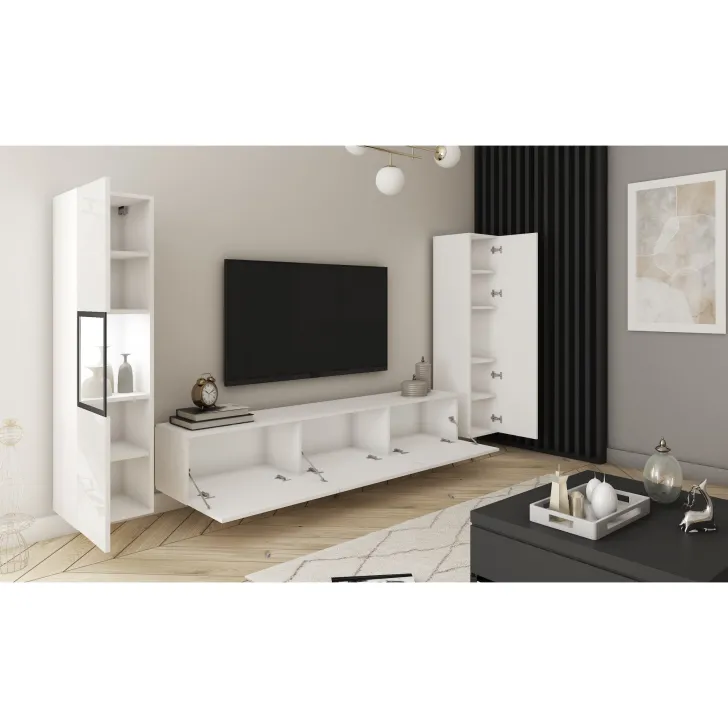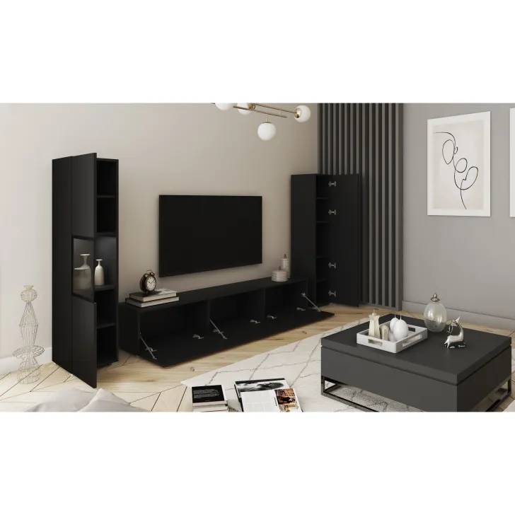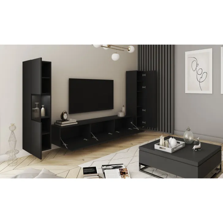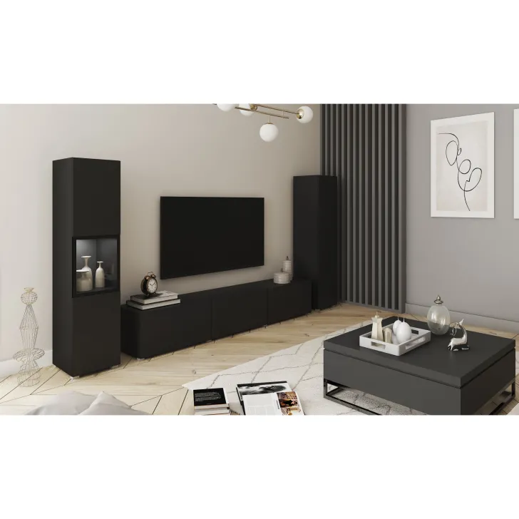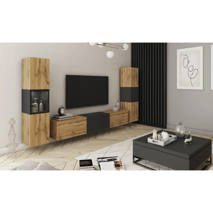 • Wielofunkcyjność i praktyczność: szafka TV z trzema schowkami, boczna witryna z półkami, oraz dodatkowa szafka/słupek z półkami. Zapewniają sporo miejsca do przechowywania różnego rodzaju przedmiotów.