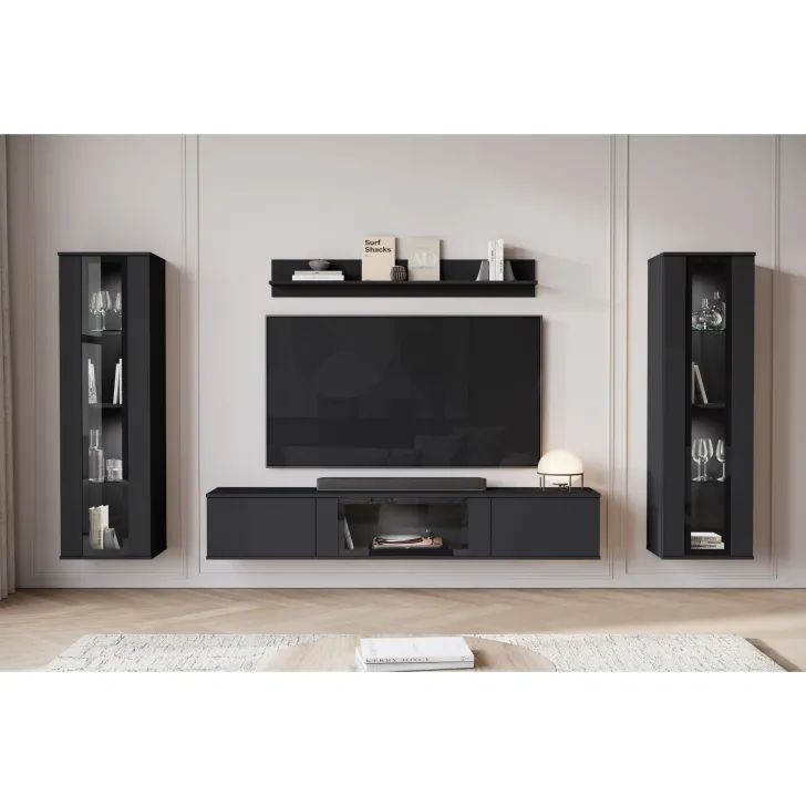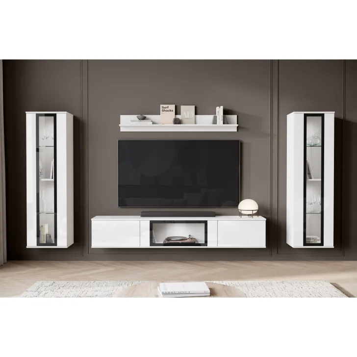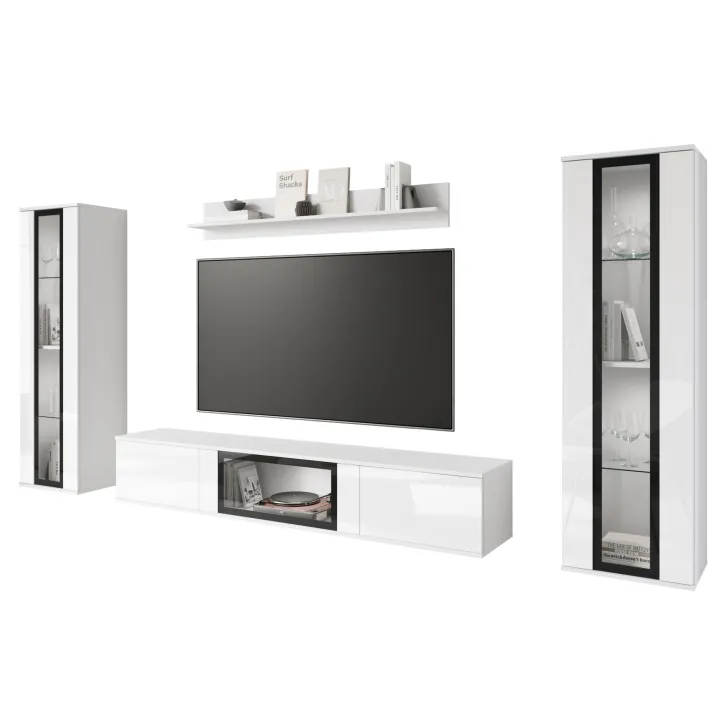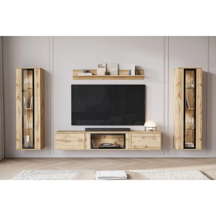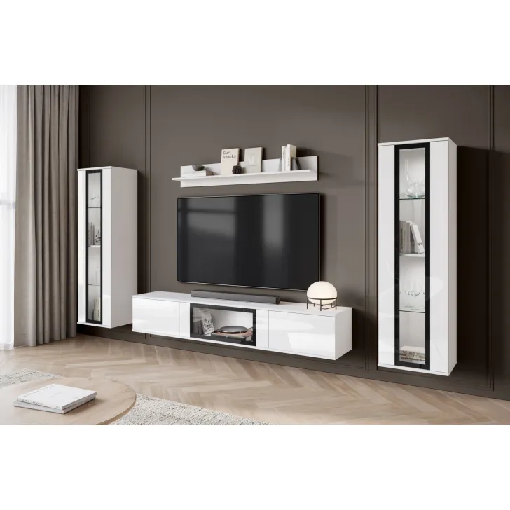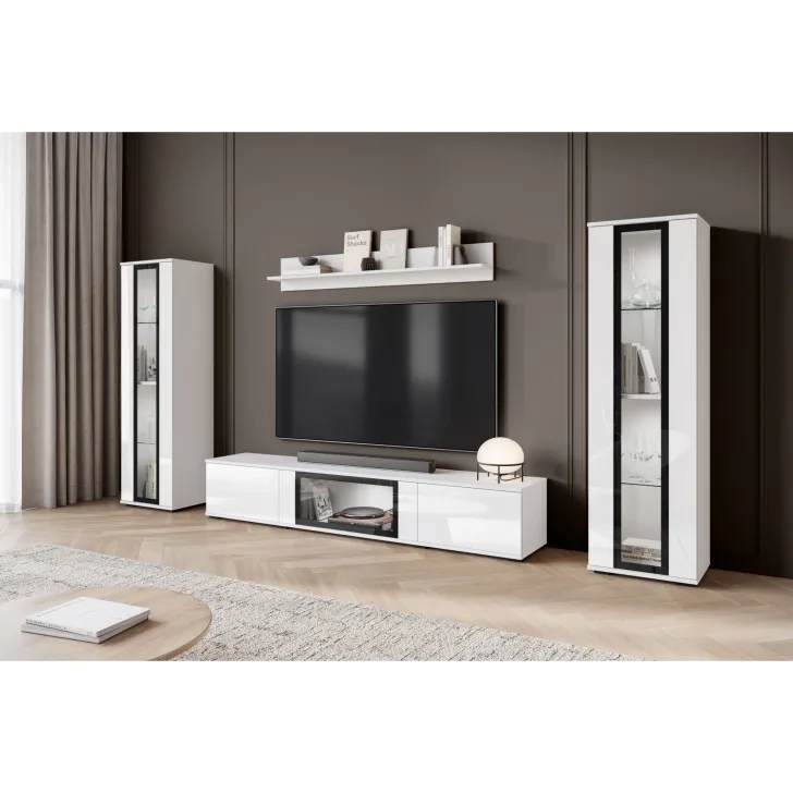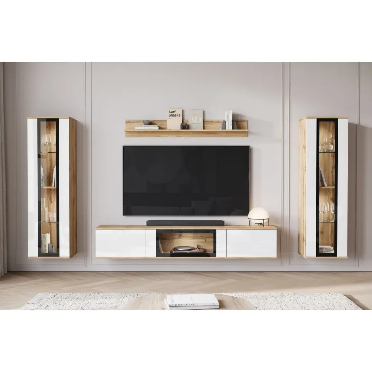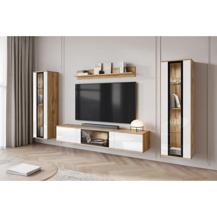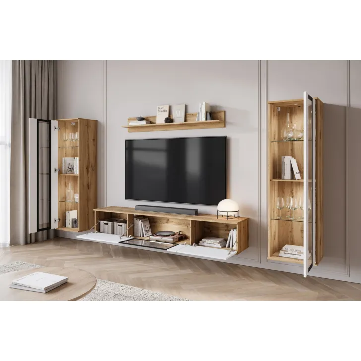 Ciesząca się popularnością Meblościanka FARO to zdecydowanie nowoczesne spojrzenie na klasyczny mebel. Z daleka odbiegająca od starych przekonań o ciężkich, niepraktycznych meblach, nasza oferta wprowadza prawdziwą rewolucję w aranżacji Twojego salonu. Meblościanka FARO to przede wszystkim wygoda i funkcjonalność, czy to zawieszona na ścianie, czy stojąca na nóżkach - daje Ci pełną swobodę w decyzji, jak możemy zdobić zarówno małe, jak i większe pomieszczenia. Ten 4-częściowy zestaw gwarantuje wiele możliwości przechowywania, a jednocześnie idealnie prezentuje Twoje ulubione dekoracje. Witryny boczne z częściowo przeszklonymi frontami drzwi zawierają półki, na których doskonale wyeksponujesz swoją zastawę czy inne unikalne ozdoby. Szafka RTV oferuje wygody schowek, ukryty za drzwiami otwieranymi z góry do dołu w systemie klap. Dodatkowo, w środkowej części szafki zostało umieszczone przeszklenie, które stanowi doskonałe miejsce na ekspozycję dodatkowych elementów dekoracyjnych czy książek.