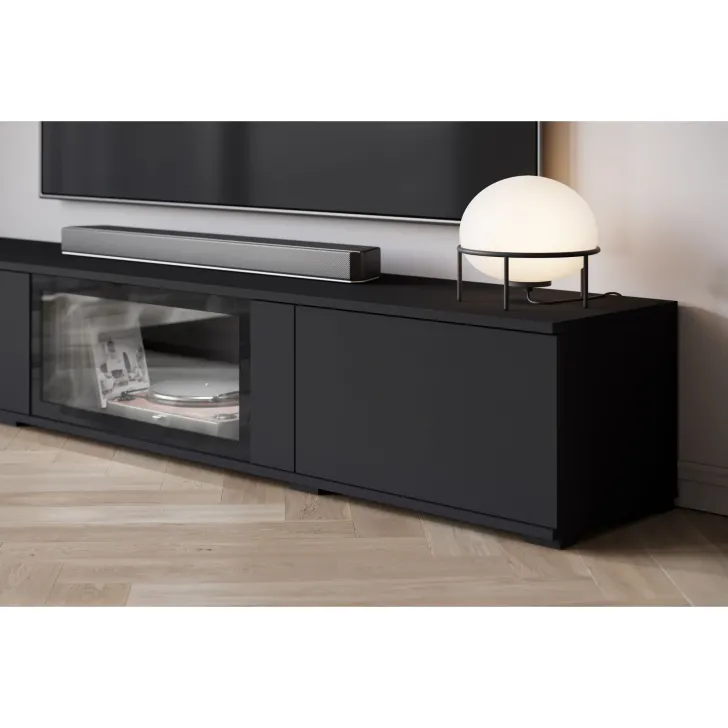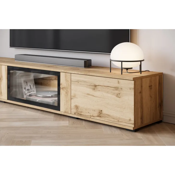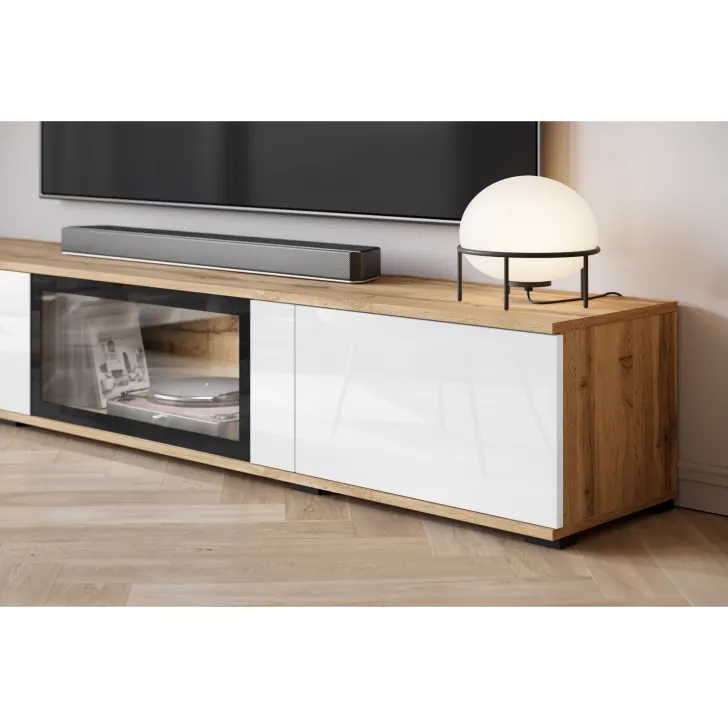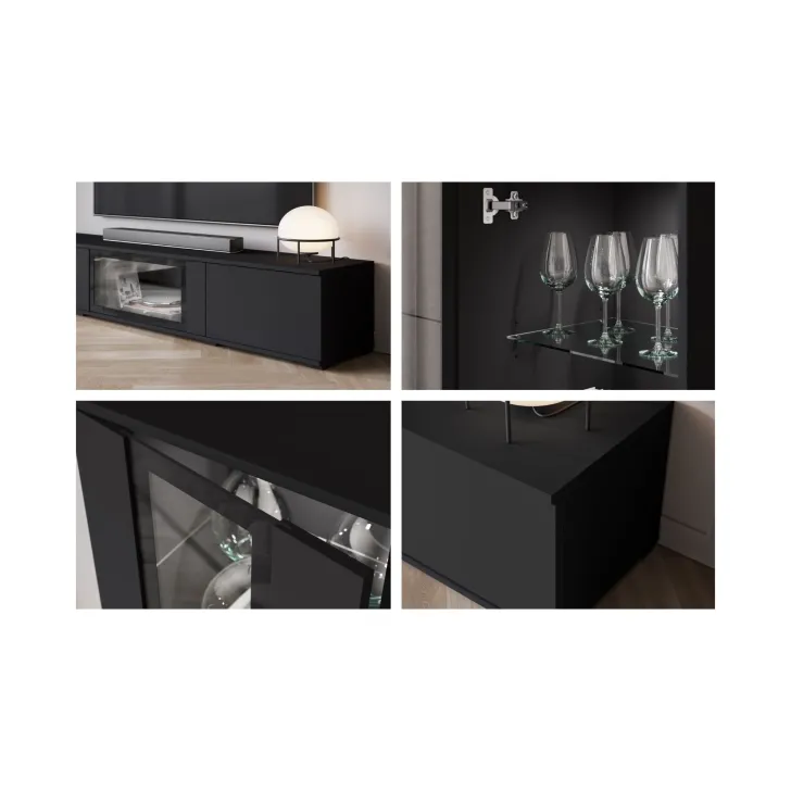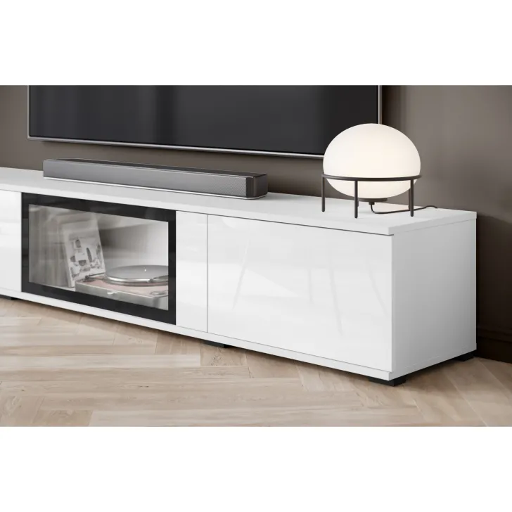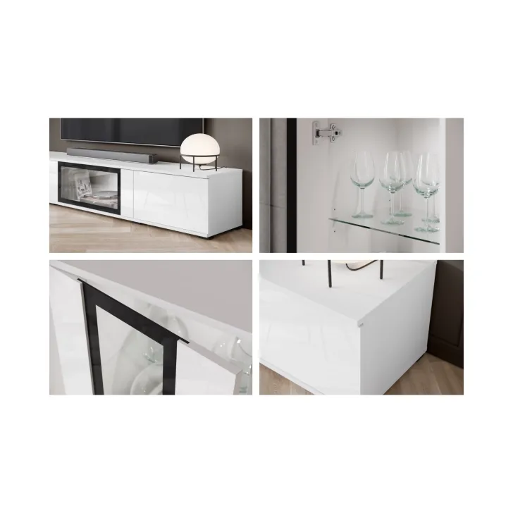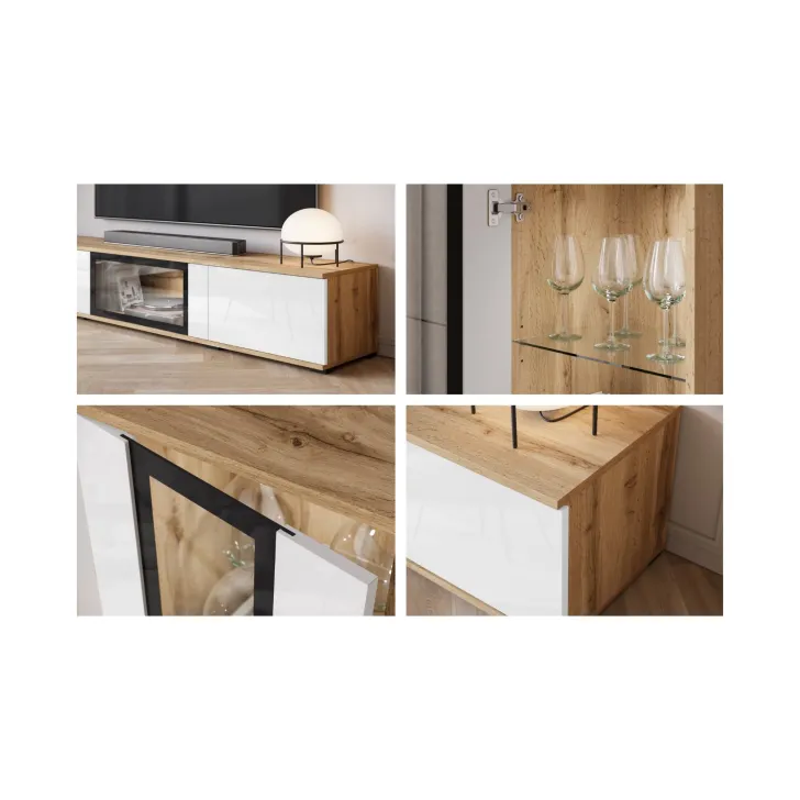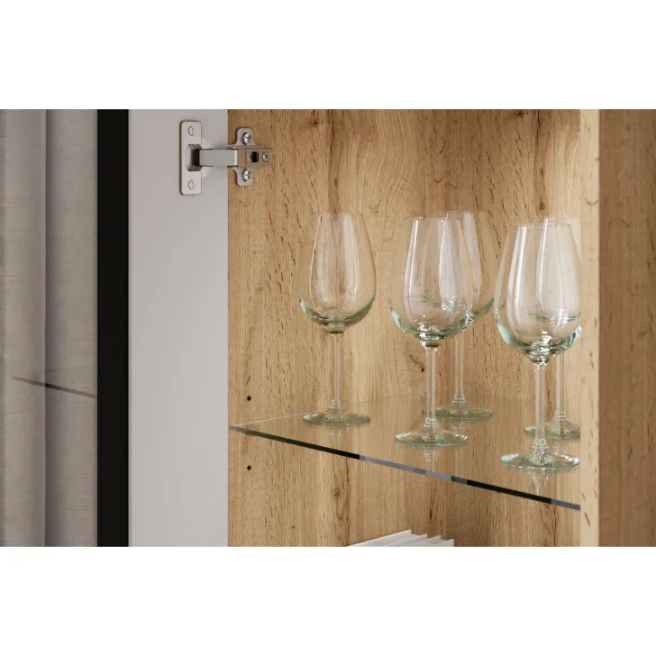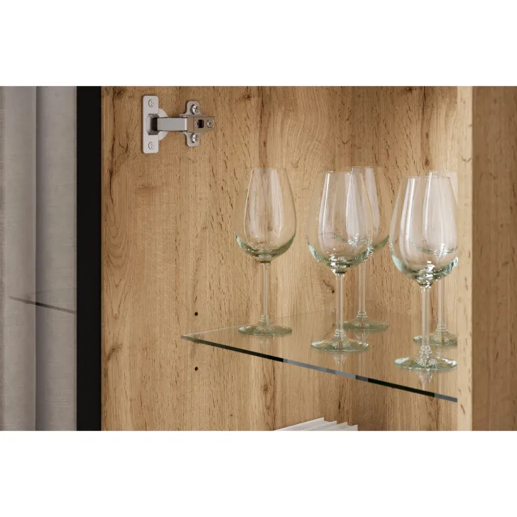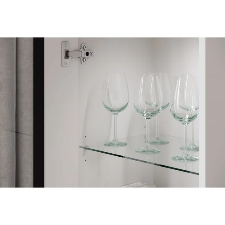 - Bezpieczeństwo i elegancja – drzwi z przeszkleniem w witrynach i w środkowej klapie szafki RTV są z hartowanego szkła, a półki wykonane z przezroczystego szkła o grubości 4 mm.