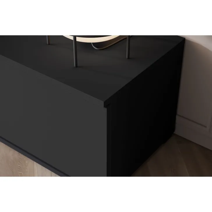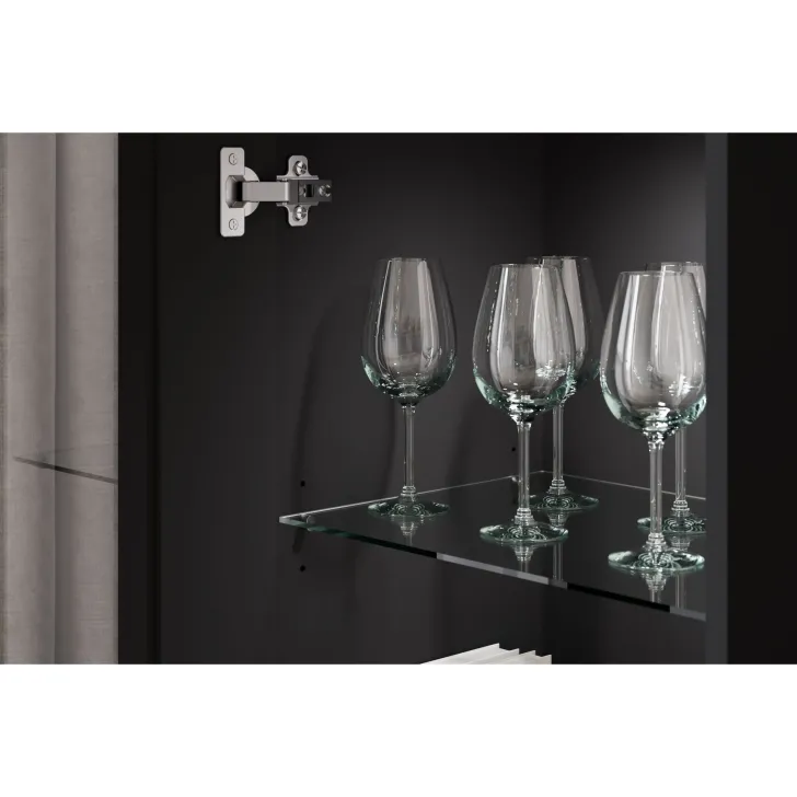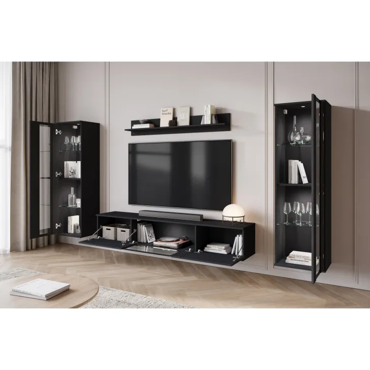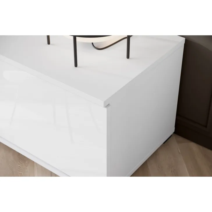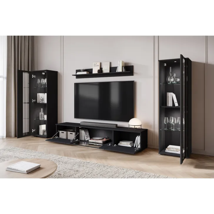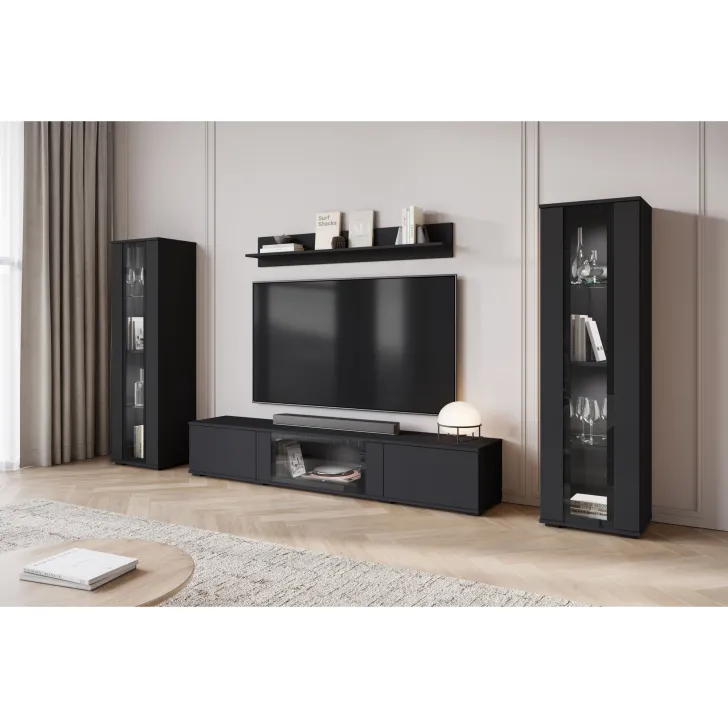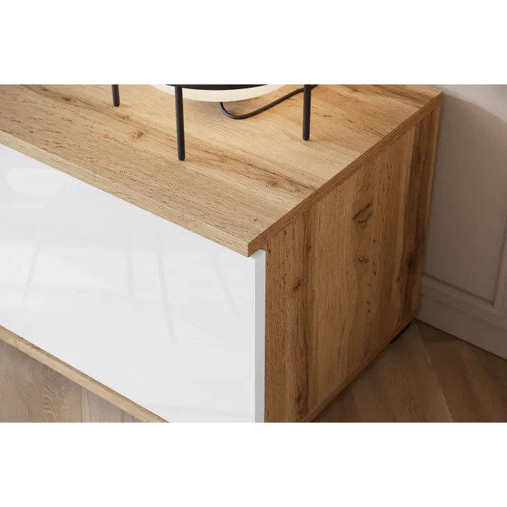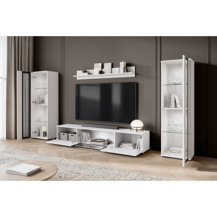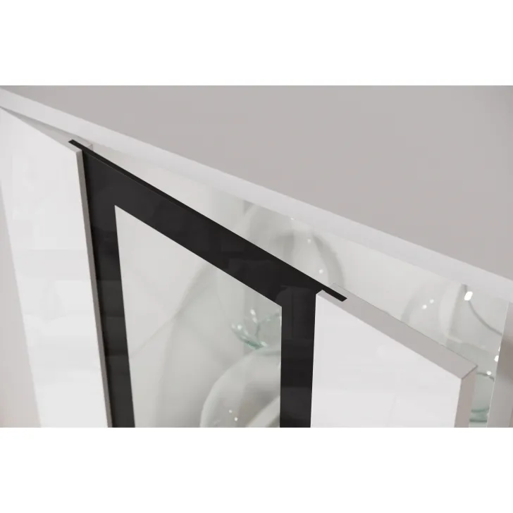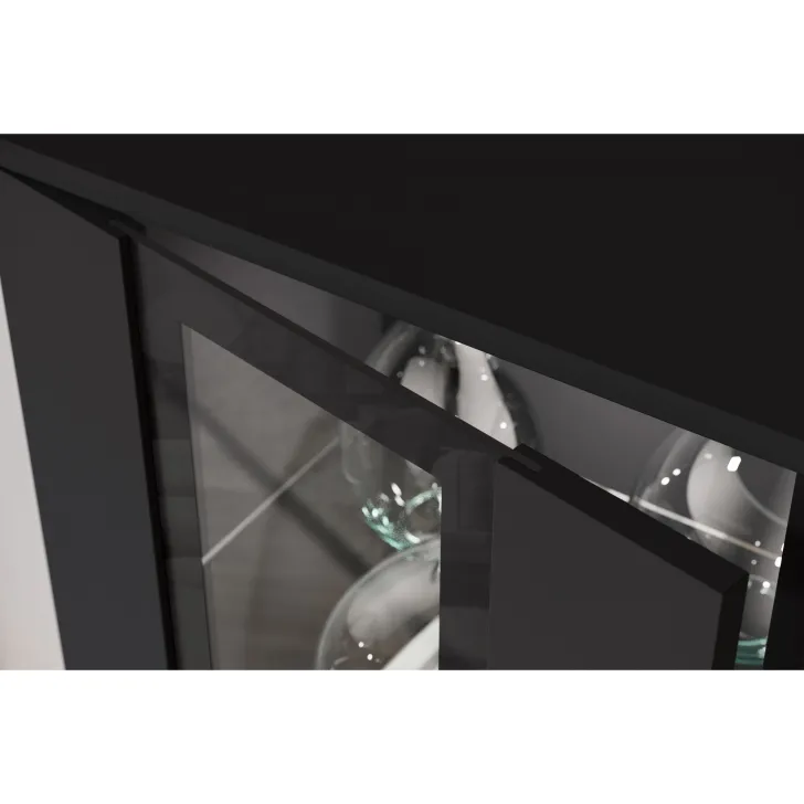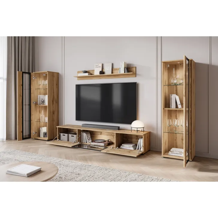 - Bezpieczeństwo i elegancja – drzwi z przeszkleniem w witrynach i w środkowej klapie szafki RTV są z hartowanego szkła, a półki wykonane z przezroczystego szkła o grubości 4 mm.