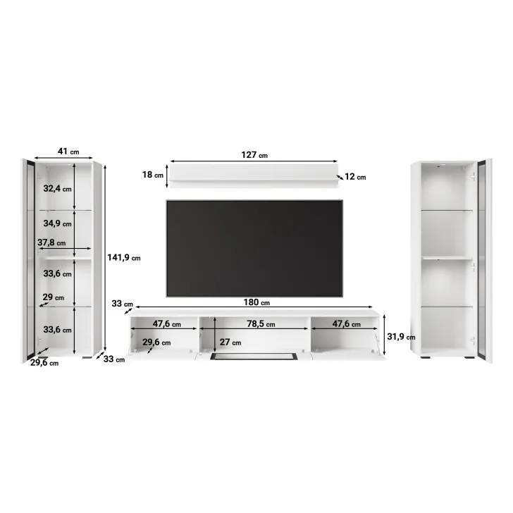 - Szafka RTV: 180 cm (szerokość) x 30 cm (wysokość) x 33 cm (głębokość). Dodatkowe 2 cm wysokości przy wyborze wersji stojącej.