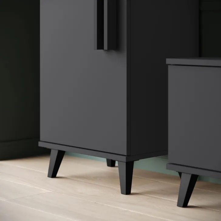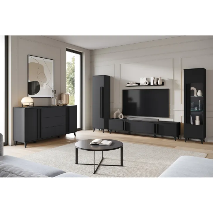 Meblościanka HURON II to idealne rozwiązanie do codziennego użytku, pozwala na pełne zorganizowanie przestrzeni salonu, dodając mu elegancji. Stabilne nóżki zapewniają pewne podparcie dla mebli, a jednocześnie ułatwiają czyszczenie podłogi pod nimi. Istnieje też możliwość zakupu meblościanki z opcjonalnym oświetleniem LED, które doda wnętrzu wyjątkowego klimatu. HURON II oferowany jest w trzech wariantach kolorystycznych: czarny, congo/czarny lub dąb artisan/czarny - wybierz ten, który najlepiej pasuje do atmosfery Twojego salonu.