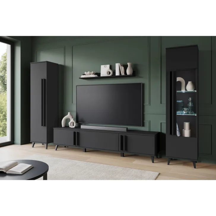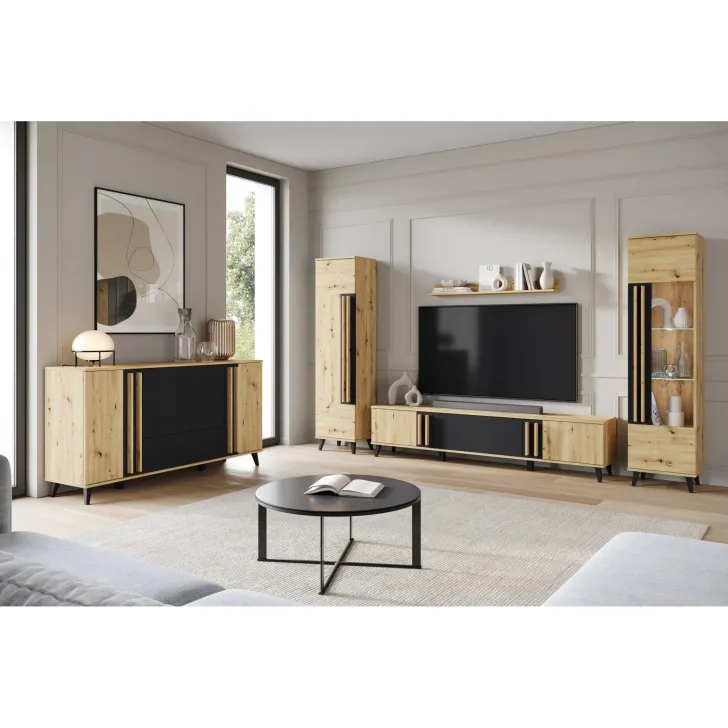 Odkryj elegancką ściankę meblową HURON II - estetyczny i praktyczny zestaw mebli do salonu. Zestaw mebli HURON II cechuje harmonijność i spójność. Jego geometryczne kształty łatwo wpasują się w różnorodne style wnętrza i podkreślą charakter każdej aranżacji. Na uwagę zasługują wyraziste lamelowe uchwyty i ukośne nóżki, które wprowadzają wyjątkowy akcent dekoracyjny.