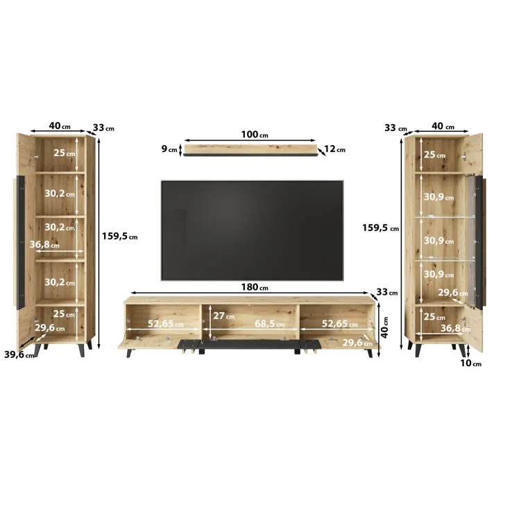 - Szafka RTV: Szer. 180 cm x Wys. 40 cm x Gł. 33 cm
