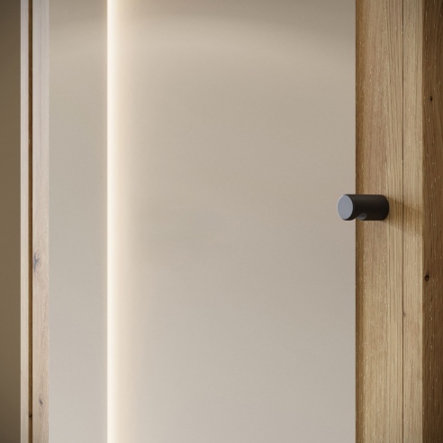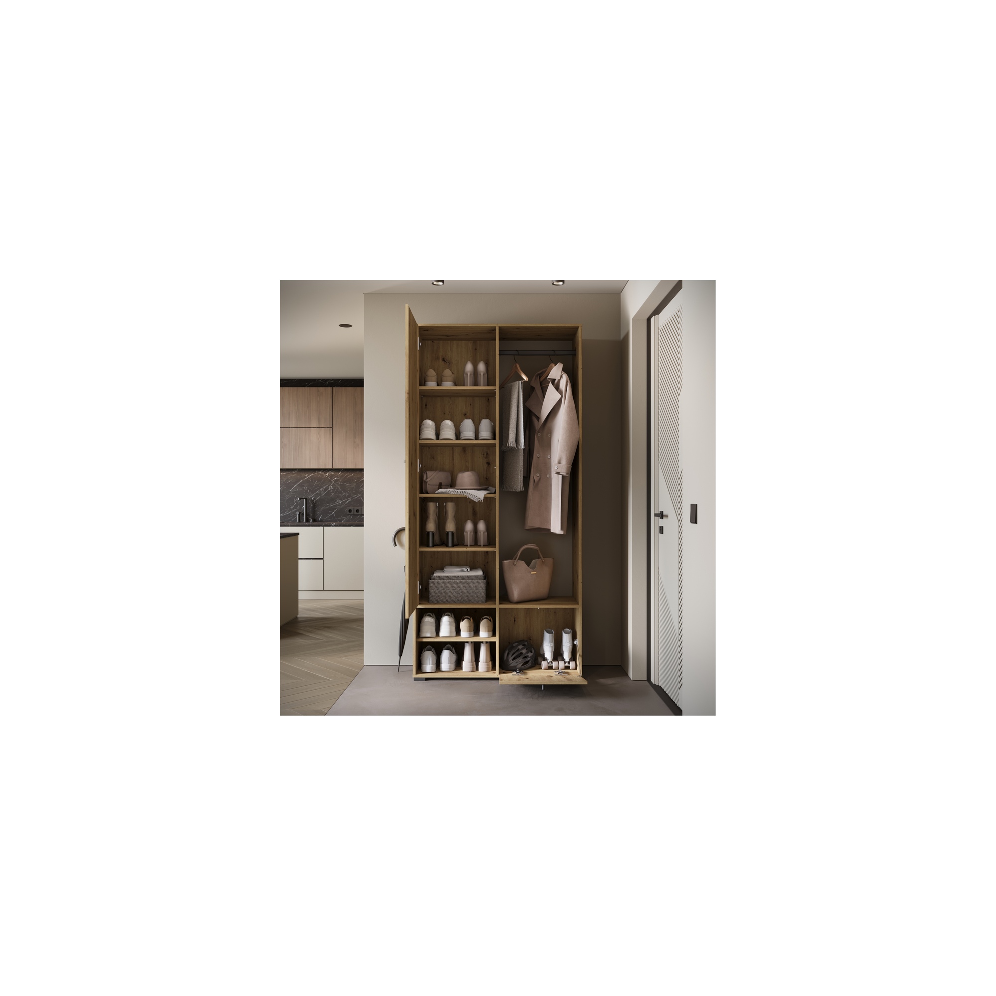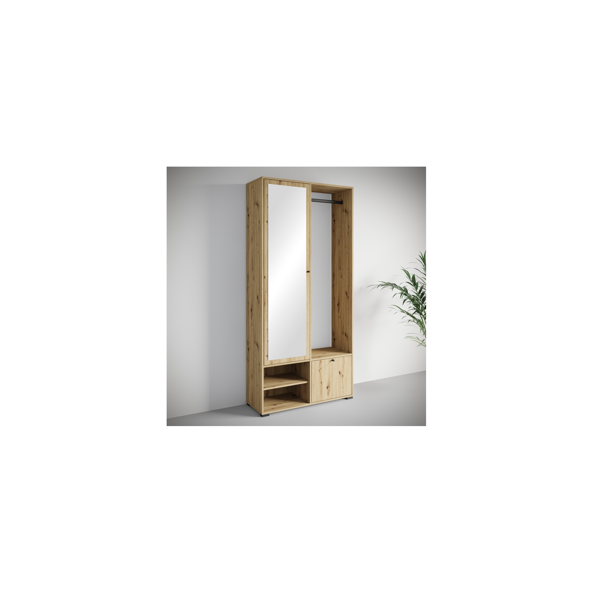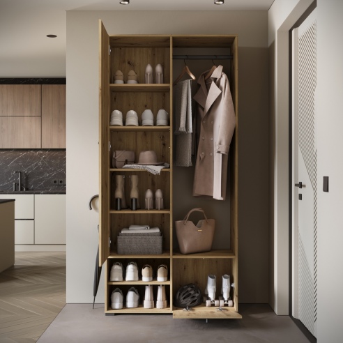 Garderoba składa się z szafy z pojemnymi półkami, z drzwiami wyposażonym w duże lustro, które optycznie powiększa przedpokój i pozwala poprawić swój wygląd przed wyjściem z domu. W skład zestawu wchodzą również: solidny metalowy drążek na ubrania, dwie otwarte wnęki oraz otwierana w systemie klapy szafka na buty.