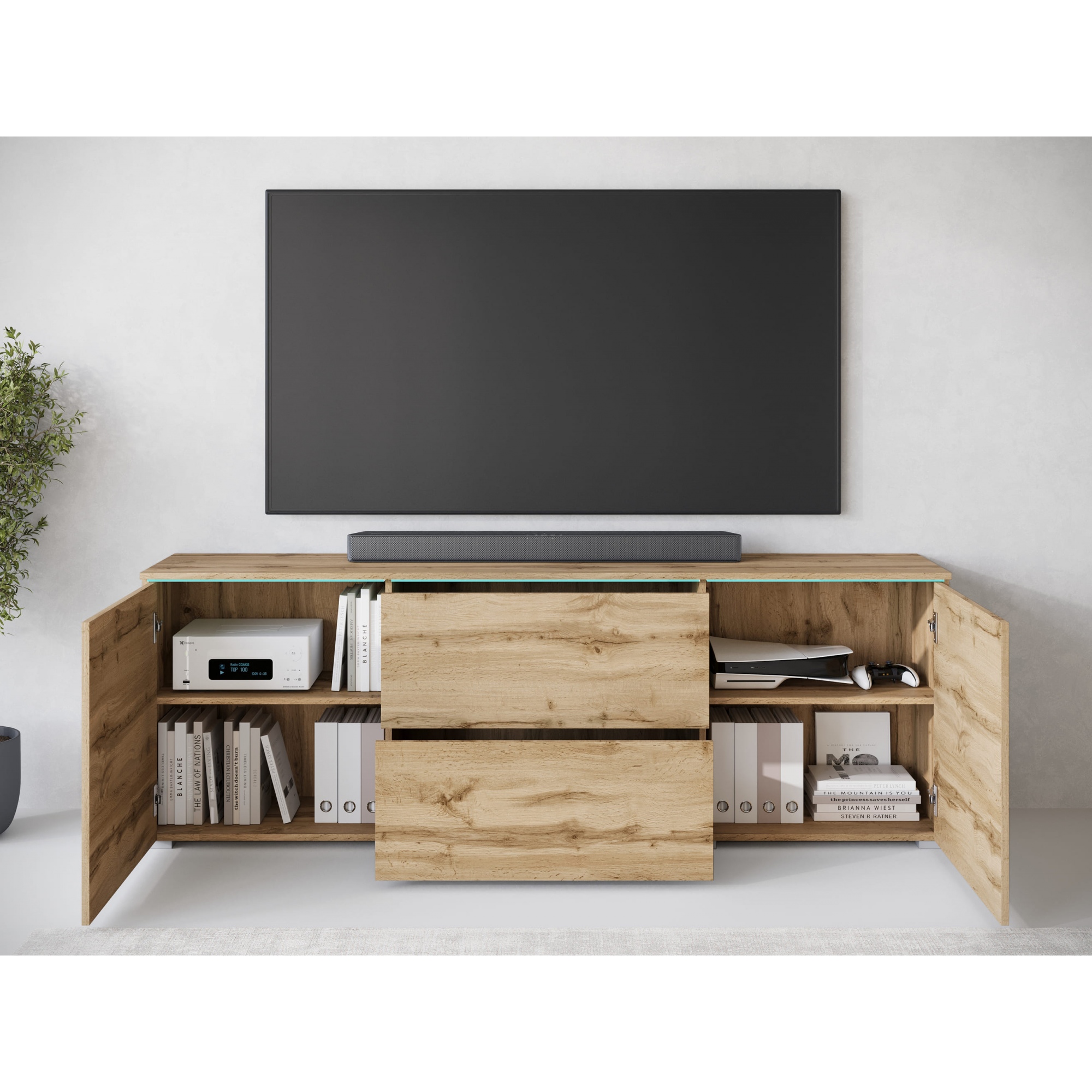 Komoda stojąca na subtelnych, minimalistycznych nóżkach, wyposażona w dwie szuflady oraz dwoje drzwi, za którymi znajdują się pojemne wnęki przedzielone półkami.