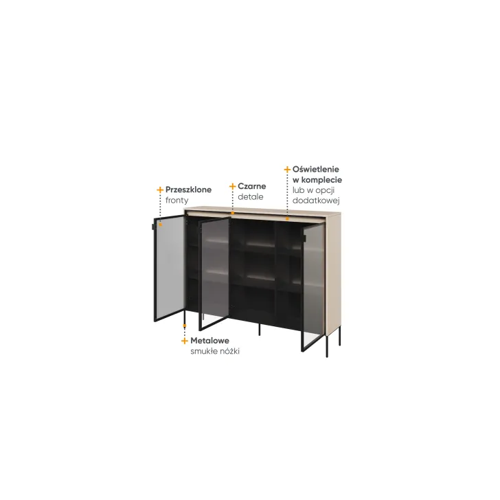 Przeszklona komoda "TREVIOLO", to nie tylko piękno, ale również praktyka rozwiązania that will pouczają ci swoją funkcjonalnością. Zdecyduj się na komodę, która stanie się swojego rodzaju ozdobą Twojego wnętrza, jednocześnie umożliwiając komfort przechowywania różnorodnych rzeczy.