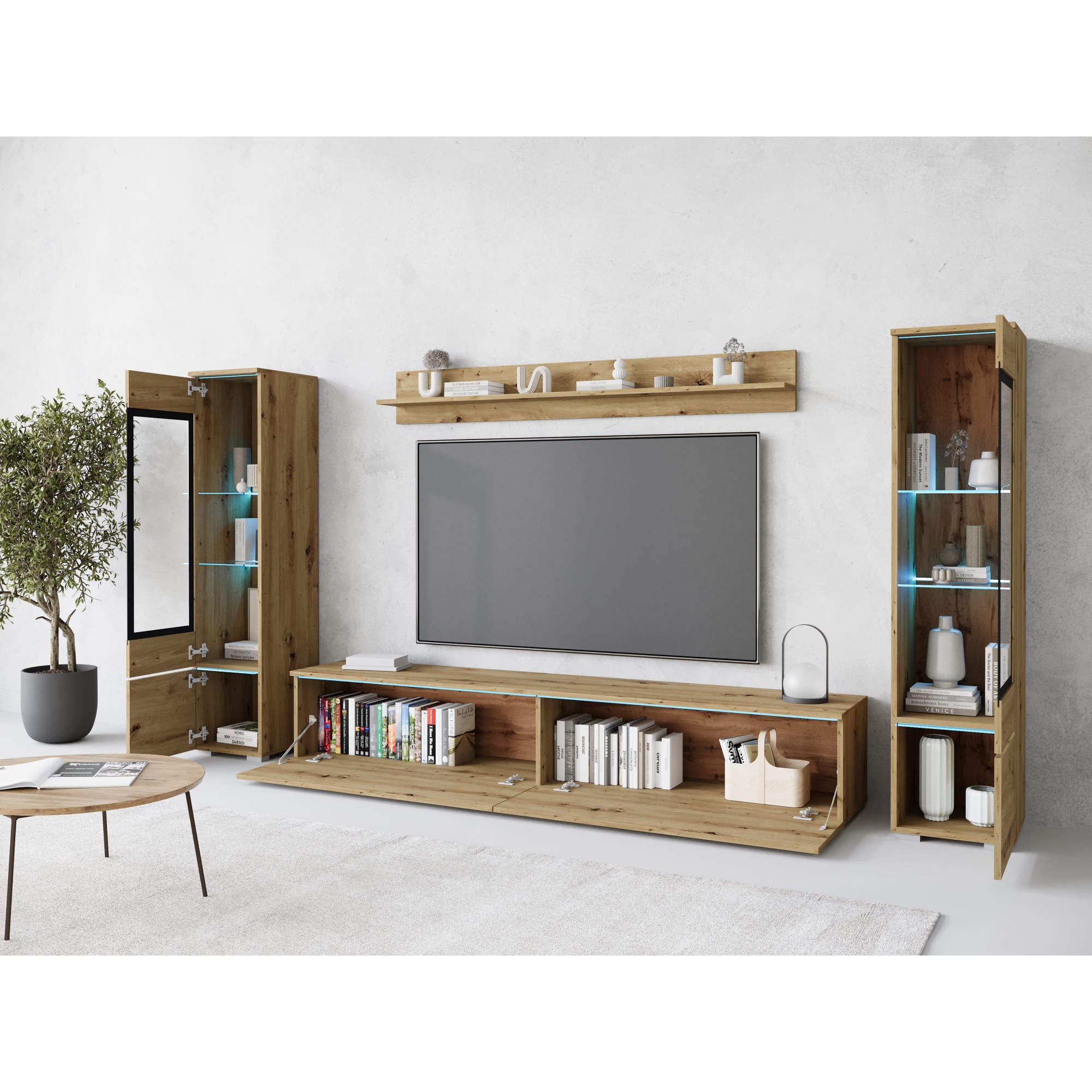 Modułowe meble do salonu - szafka RTV, półka i dwie witryny.