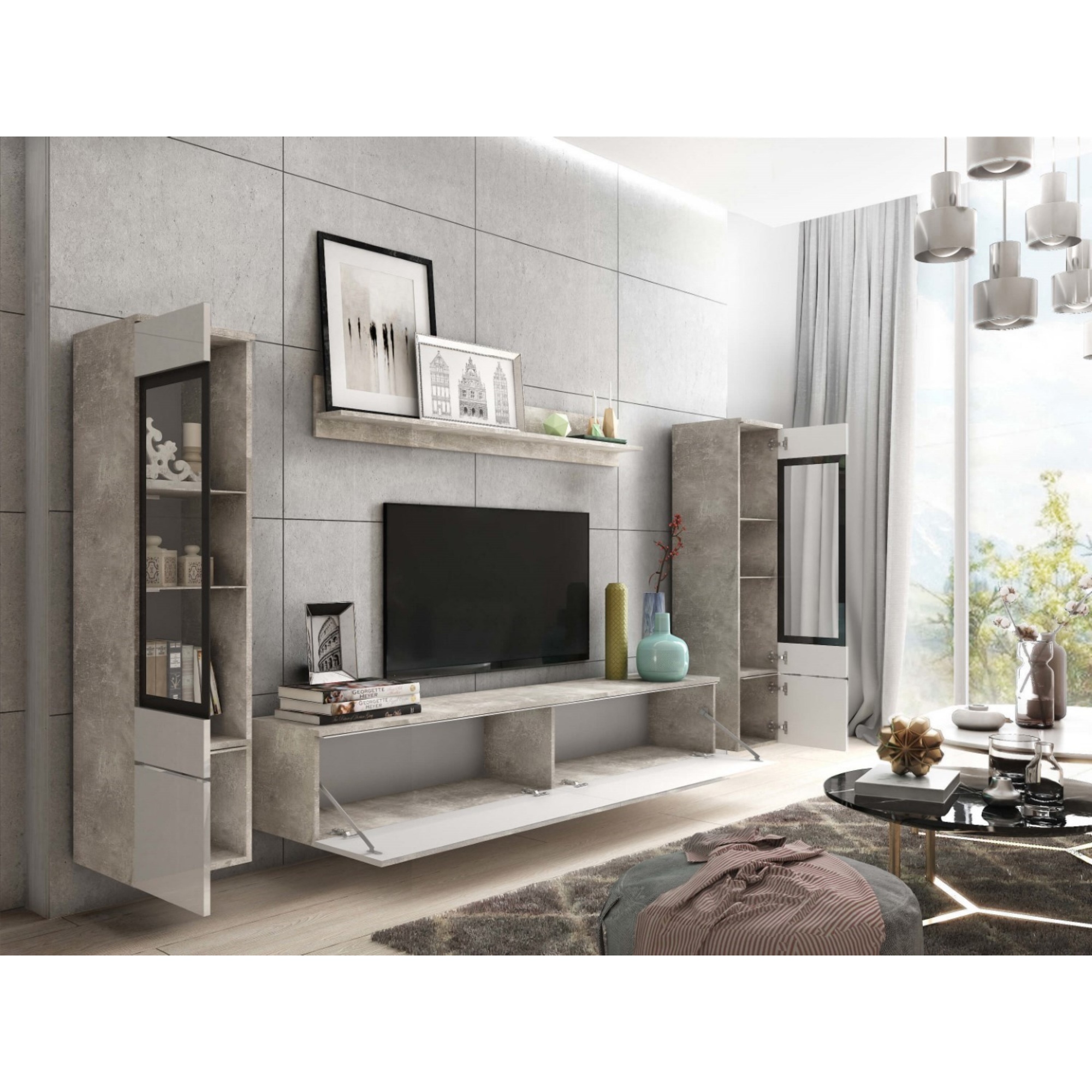 Modułowe meble do salonu - szafka RTV, półka i dwie witryny.
