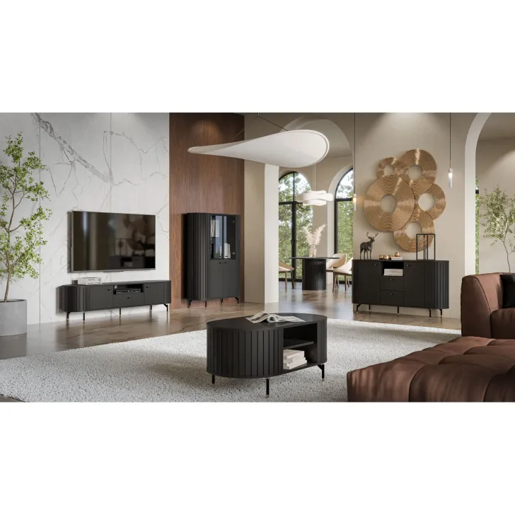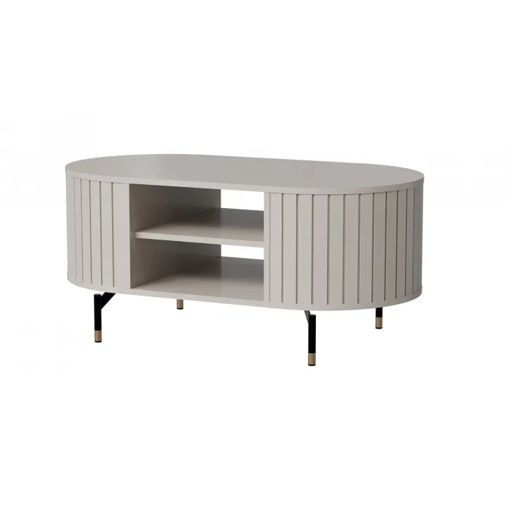 Dopełnia go subtelny, ale wyrazisty kontrast między korpus a nóżkami stolika. Nóżki w kolorze czarno-złotym dodają lekkości, podkreślając nowoczesny charakter mebla.