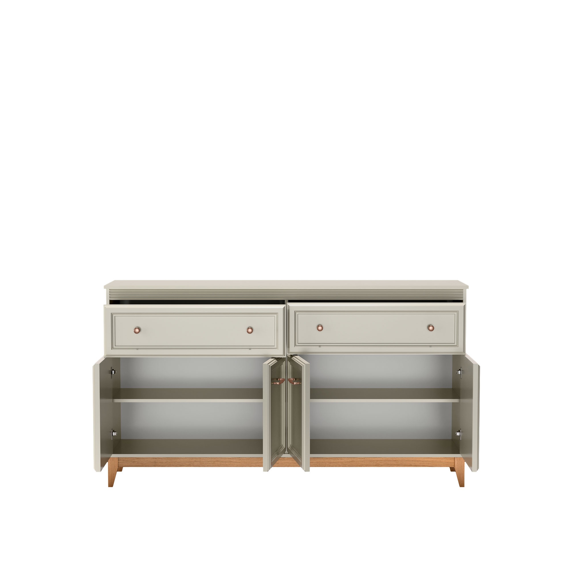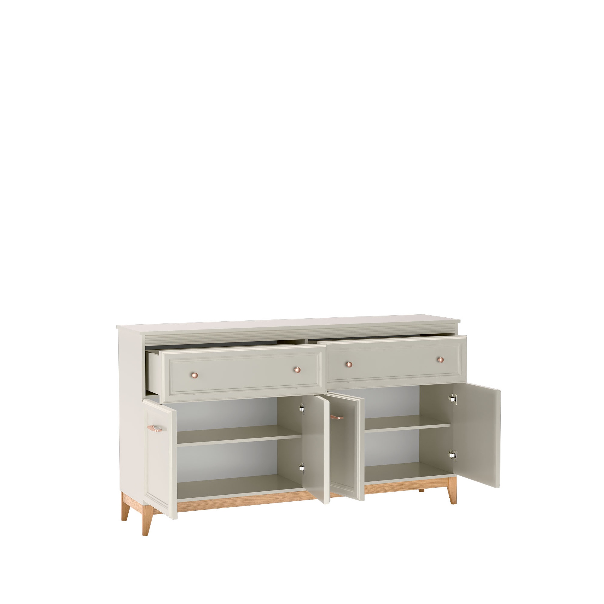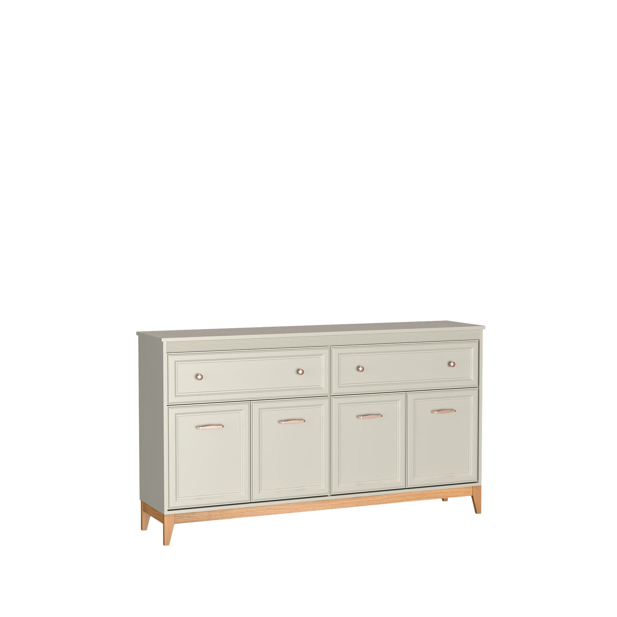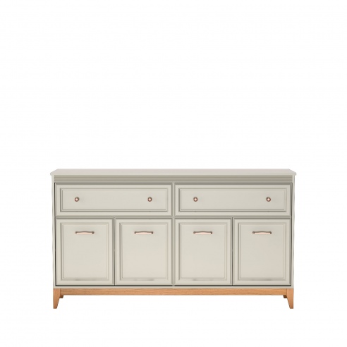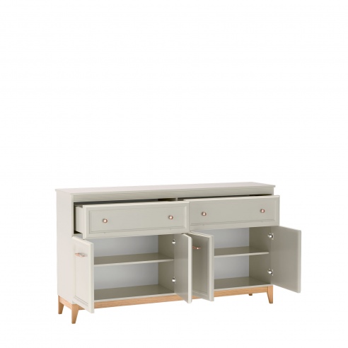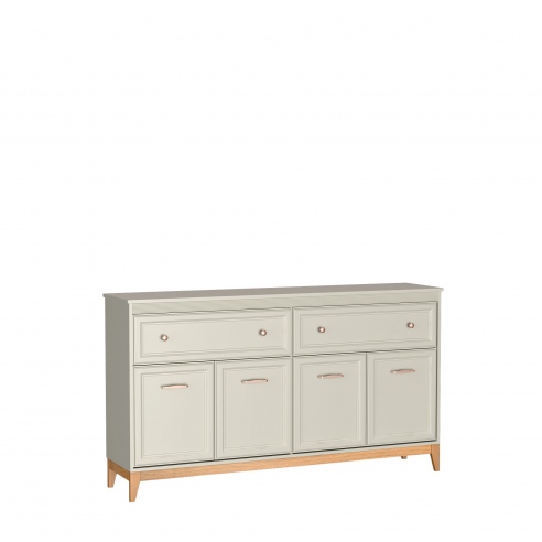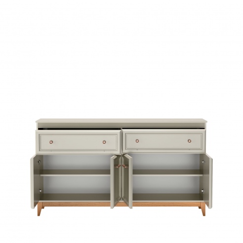 Komoda to praktyczne rozwiązanie dla osób ceniących porządek, trwałość i estetykę. Spełni swoja rolę w każdym pomieszczeniu w którym potrzebujemy miejsca na przechowywanie. Dwie przestronne szuflady zlokalizowane w górnej części pomogą uporządkować drobne akcesoria, a zamykane szafki z półkami w dolnej części zapewniają mnóstwo miejsca na przechowywanie. Kolekcja DUBAI to meble pełne harmonii i wyważonej elegancji. Doskonale komponują się zarówno w klasycznych jak i nowoczesnych aranżacjach. Zestawienie ciepłego naturalnego drewna z odcieniem kaszmir nadaje lekkości, a dekoracyjne listwy MDF na frontach dodają klasycznego uroku i subtelnie zdobią bryłę. Stylowe uchwyty w kolorze miedzi to detal podkreślający charakter mebli. Stabilne nogi z litego drewna dębowego gwarantują trwałość i naturalne piękno. |
