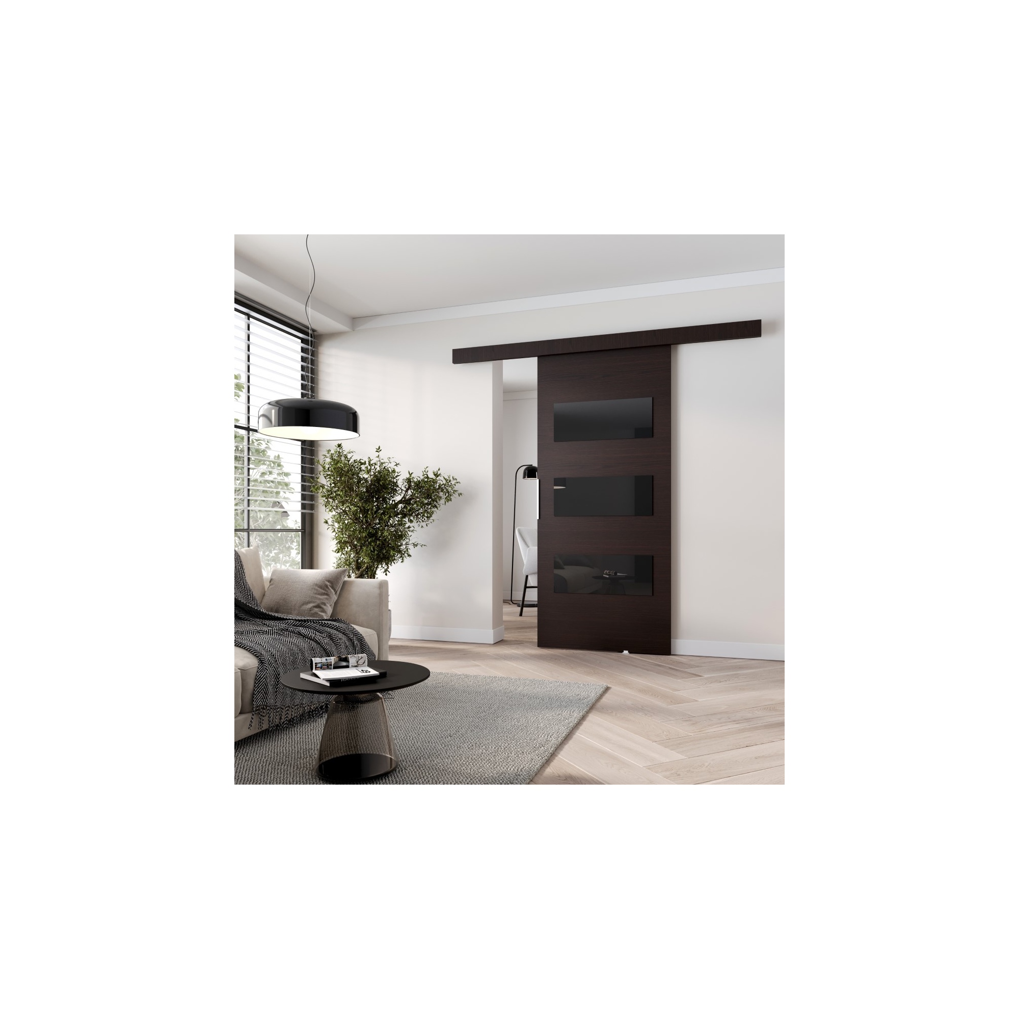 Drzwi wewnętrzne przesuwne to rozwiązanie uniwersalne, które nie tylko pasuje do różnego typu aranżacji, ale znajdzie zastosowanie w każdym pomieszczeniu. Minimalizm drzwi dodaje wnętrzu nowoczesności i sprawia, że wnętrze jak wyjęte z pierwszych stron najlepszych magazynów. Idealne rozwiązanie dla każdego, kto chce optymalnie wykorzystać przestrzeń. Zastosowanie najwyższej jakości materiałów oraz nowoczesny system przesuwny sprawiają, że nasze drzwi przesuwne to idealne rozwiązanie do każdego wnętrza. Dzięki szerokiej gamie kolorów i wzorów każdy znajdzie coś dla siebie. Front z czarnymi panelami ozdobnymi (szkło lacobel).
