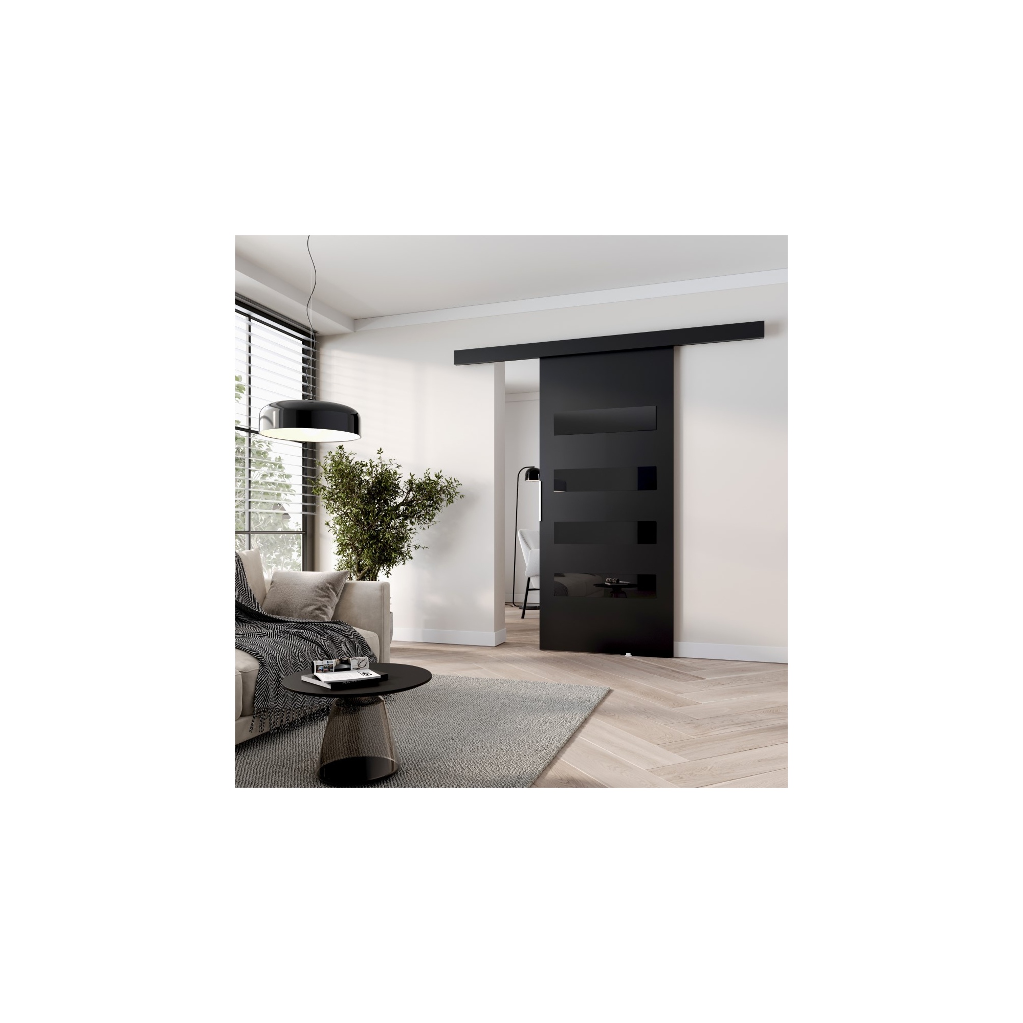 Drzwi wewnętrzne przesuwne to rozwiązanie uniwersalne, które nie tylko pasuje do różnego typu aranżacji, ale znajdzie zastosowanie w każdym pomieszczeniu. Minimalizm drzwi dodaje wnętrzu nowoczesności i sprawia, że wnętrze jak wyjęte z pierwszych stron najlepszych magazynów. Idealne rozwiązanie dla każdego, kto chce optymalnie wykorzystać przestrzeń. Zastosowanie najwyższej jakości materiałów oraz nowoczesny system przesuwny sprawiają, że nasze drzwi przesuwne to idealne rozwiązanie do każdego wnętrza. Dzięki szerokiej gamie kolorów i wzorów każdy znajdzie coś dla siebie. Front z czarnymi panelami ozdobnymi (szkło lacobel).
