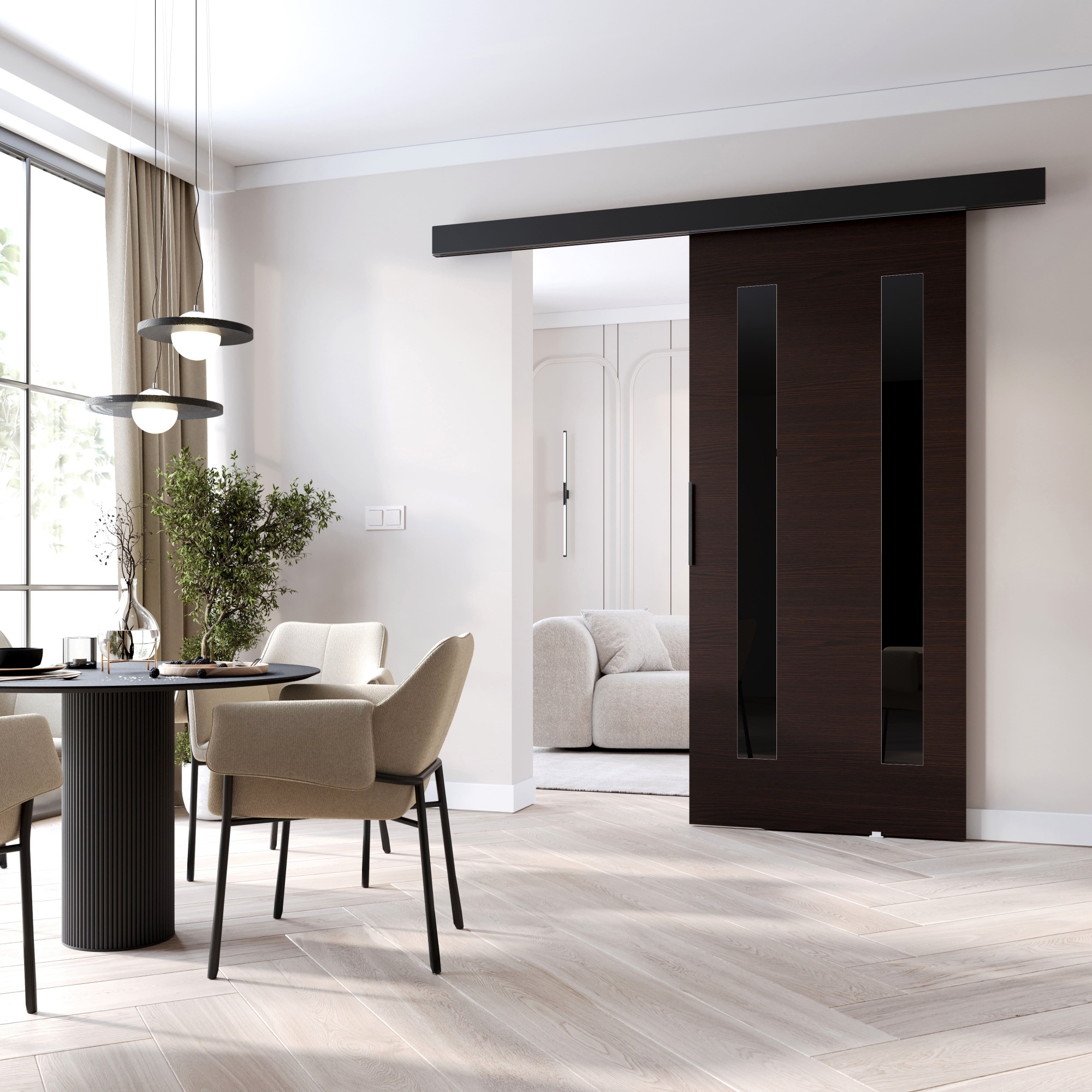 Drzwi wewnętrzne przesuwne to rozwiązanie uniwersalne, które nie tylko pasuje do różnego typu aranżacji, ale znajdzie zastosowanie w każdym pomieszczeniu. Minimalizm drzwi dodaje wnętrzu nowoczesności i sprawia, że wnętrze jak wyjęte z pierwszych stron najlepszych magazynów. Idealne rozwiązanie dla każdego, kto chce optymalnie wykorzystać przestrzeń. Zastosowanie najwyższej jakości materiałów oraz nowoczesny system przesuwny sprawiają, że nasze drzwi przesuwne to idealne rozwiązanie do każdego wnętrza. Dzięki szerokiej gamie kolorów i wzorów każdy znajdzie coś dla siebie. Front z czarnymi panelami ozdobnymi (szkło lacobel).