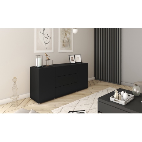 Komoda posiada dwoje drzwi, za którymi znajdują się półki. Trzy pojemne szuflady mają do zaoferowania dużo miejsca, dzięki czemu zyskujemy dodatkowe miejsce do przechowywania różnych rzeczy. Taki układ pomoże zadbać o organizację i przechowywanie, a blat posłuży jako miejsce do eksponowania ozdób czy innych dekoracji.