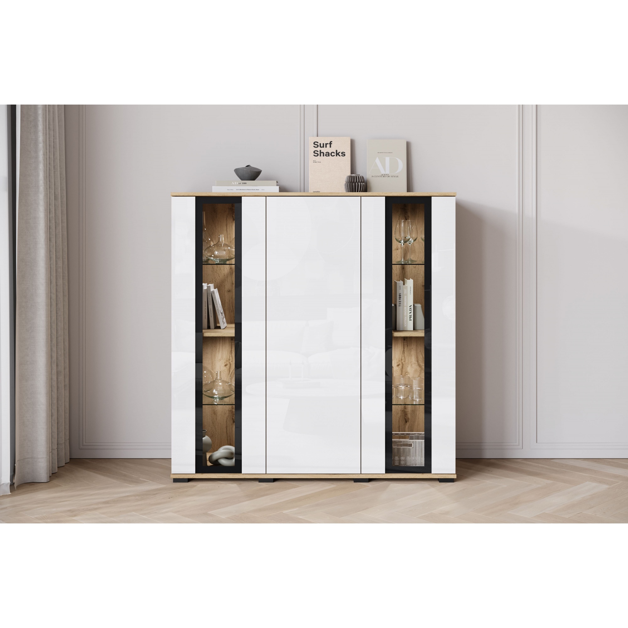 Elegancka i nowoczesna komoda z przeszklonymi witrynami to idealne rozwiązanie do salonu, jadalni lub pokoju dziennego. Funkcjonalny układ półek umożliwia estetyczne przechowywanie i eksponowanie książek, dekoracji czy pamiątek. Połączenie zamkniętych szafek z częściami przeszklonymi sprawia, że mebel jest nie tylko praktyczny, ale również stylowy. Dzięki uniwersalnemu wyglądowi z łatwością dopasuje się do różnych aranżacji wnętrz. Dodatkowo istnieje możliwość dokupienia oświetlenia LED, które subtelnie podkreśli zawartość witryn i wprowadzi przyjemny nastrój do pomieszczenia. Solidne wykonanie oraz nowoczesny design sprawiają, że komoda będzie doskonałym uzupełnieniem zarówno klasycznych, jak i bardziej nowoczesnych przestrzeni.