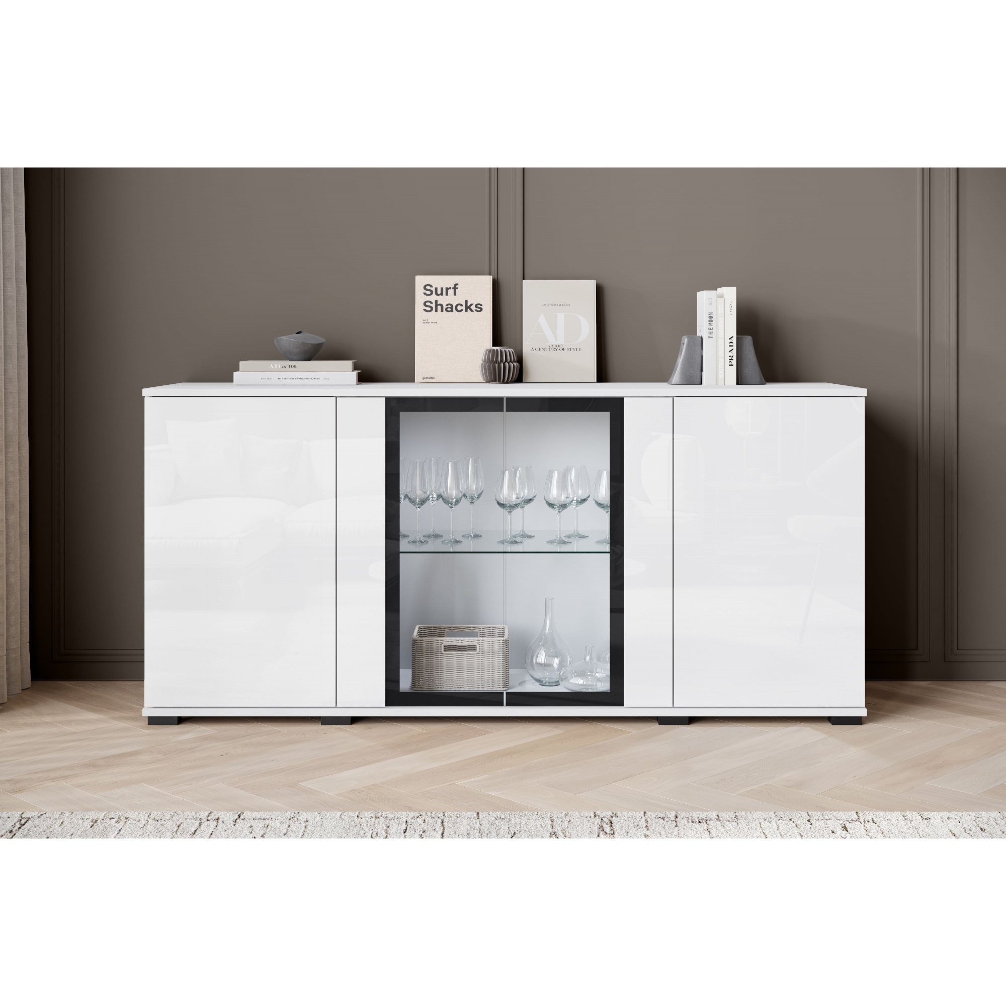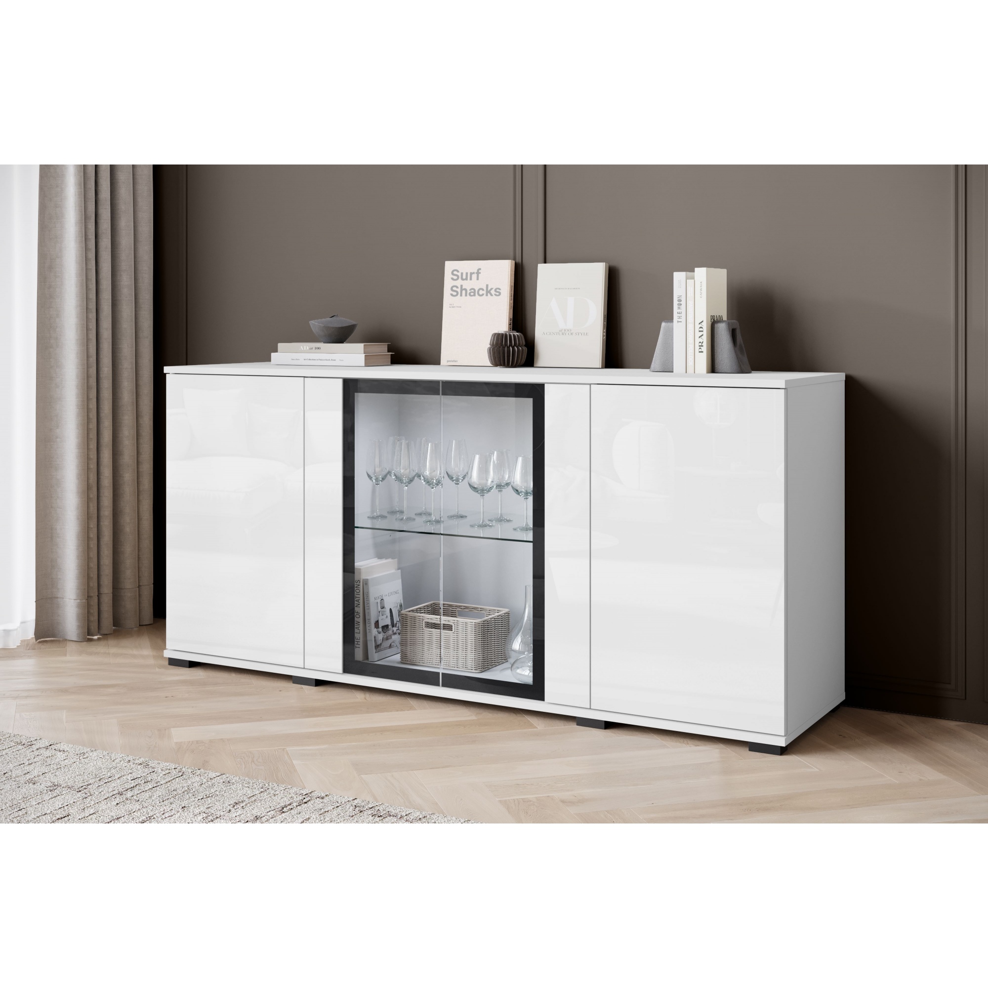Elegancka i nowoczesna komoda z przeszklonymi witrynami to idealne rozwiązanie do salonu, jadalni lub pokoju dziennego. Funkcjonalny układ półek umożliwia estetyczne przechowywanie i eksponowanie książek, dekoracji czy pamiątek. Połączenie zamkniętych szafek z przeszkloną częścią sprawia, że mebel jest nie tylko praktyczny, ale również stylowy. Dzięki uniwersalnemu wyglądowi z łatwością dopasuje się do różnych aranżacji wnętrz. Dodatkowo istnieje możliwość dokupienia oświetlenia LED, które subtelnie podkreśli zawartość witryny i wprowadzi przyjemny nastrój do pomieszczenia. Solidne wykonanie oraz nowoczesny design sprawiają, że komoda będzie doskonałym uzupełnieniem zarówno klasycznych, jak i bardziej nowoczesnych przestrzeni.