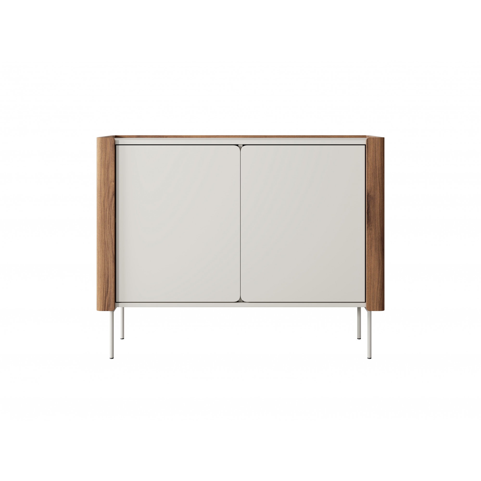 Harmonijne połączenie kaszmiru z ciepłym odcieniem orzech warmia, nadaje wnętrzu przytulności, zapewniając jednocześnie wyjątkowy efekt wizualny. Charakterystycznym elementem jest unikatowe wykończenie bocznych krawędzi, zaokrąglone narożniki na frontach i bokach dodają atrakcyjności i tworzą efektowne połączenie z minimalistyczną stylistyką.