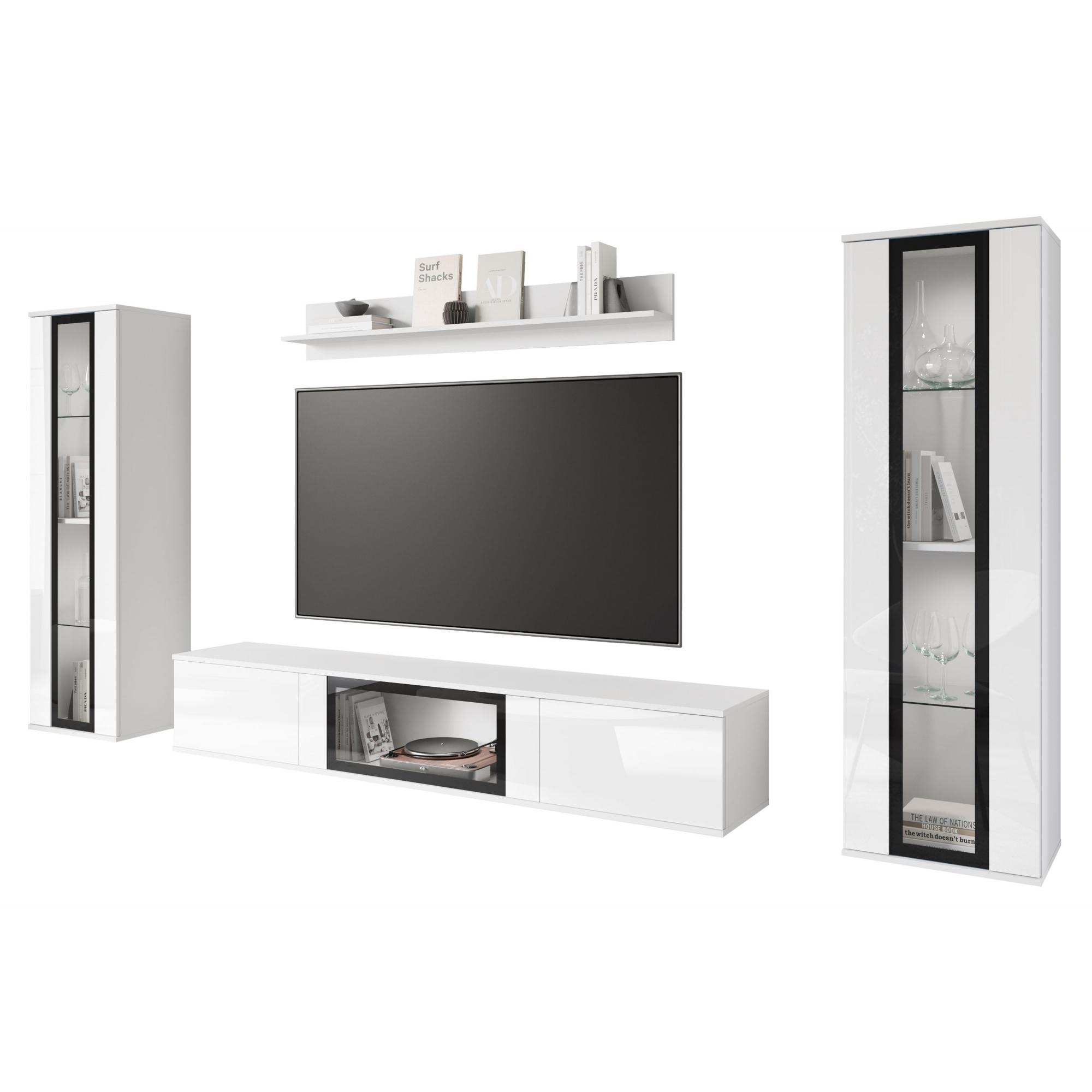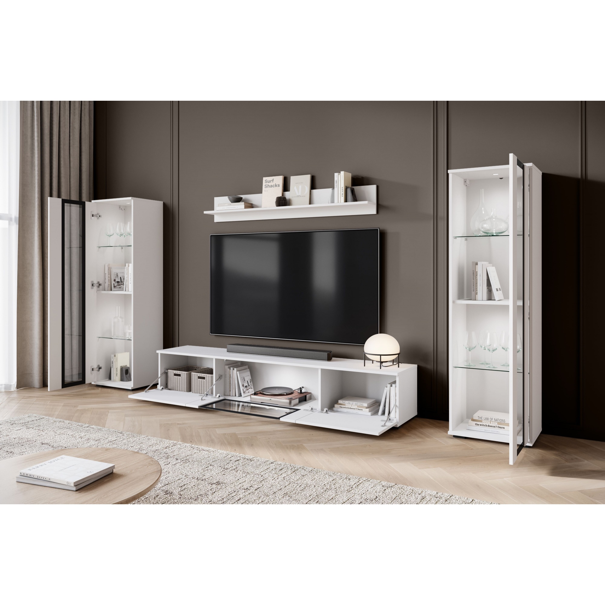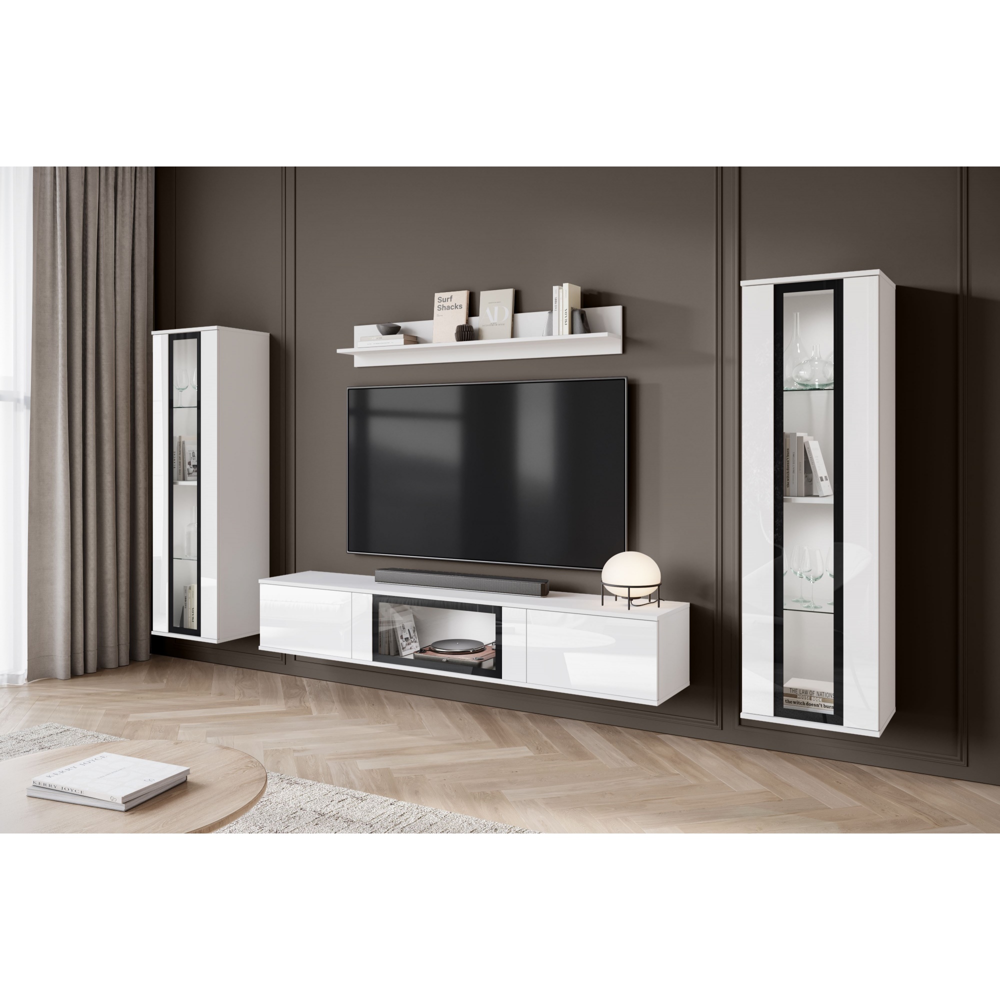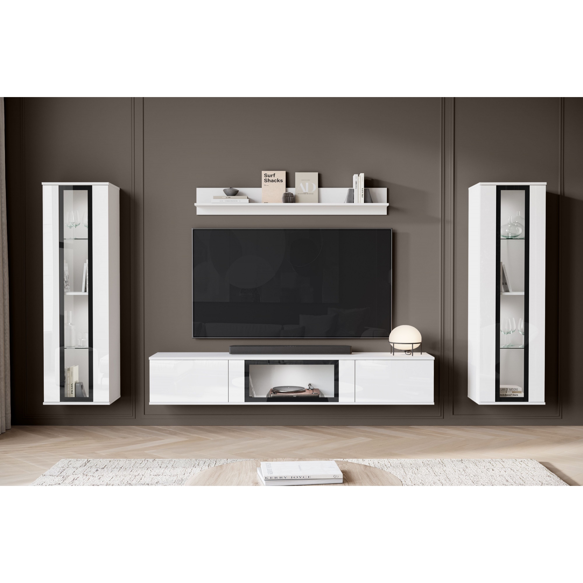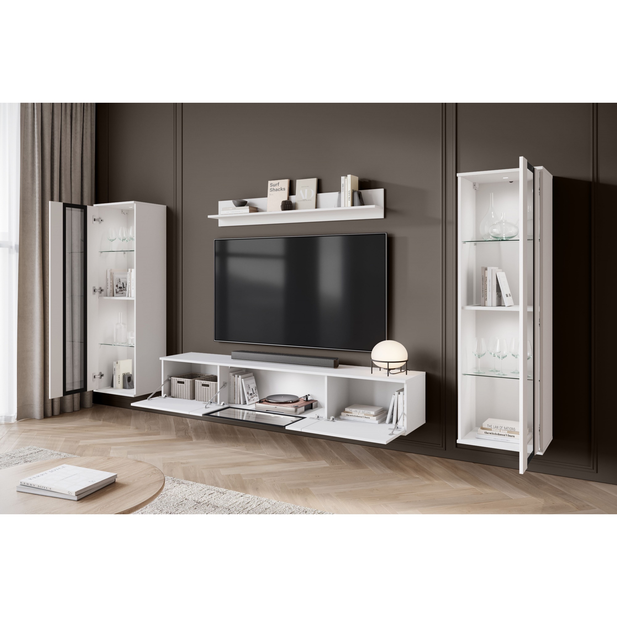 Meblościanka FARO. Meblościanka już dawno przestała się kojarzyć z ciężkim, niepraktycznym meblem. Może zostać zawieszona, lub postawiona na nóżkach, dzięki czemu jest niezwykle funkcjonalna, oraz świetnie dopasowana do małych jak i większych pomieszczeń. Ten 4-częściowy zestaw zapewnia wygodę użytkowania i wiele możliwości przechowywania. Witryny boczne za częściowo przeszklonymi frontami drzwi posiadają półki, które doskonale wyeksponują zastawę, lub inne dekoracje. Szafka TV zapewnia wygodne przechowywanie w dwóch schowkach ukrytych za drzwiami otwieranymi z góry do dołu w systemie klap. W środkowej części szafki znajduje się przeszklenie, które jest dodatkowym miejscem na ekspozycje ozdób czy książek. Do zestawu należy również wisząca półka, którą można zawiesić nad telewizorem. Minimalistyczny, lecz oryginalny wygląd Naszej meblościanki, będzie doskonałym uzupełnieniem i wzbogaceniem każdego nowoczesnego wnętrza, a materiały z jakich została wykonana zapewnią wytrzymałość i długoletnie użytkowanie.