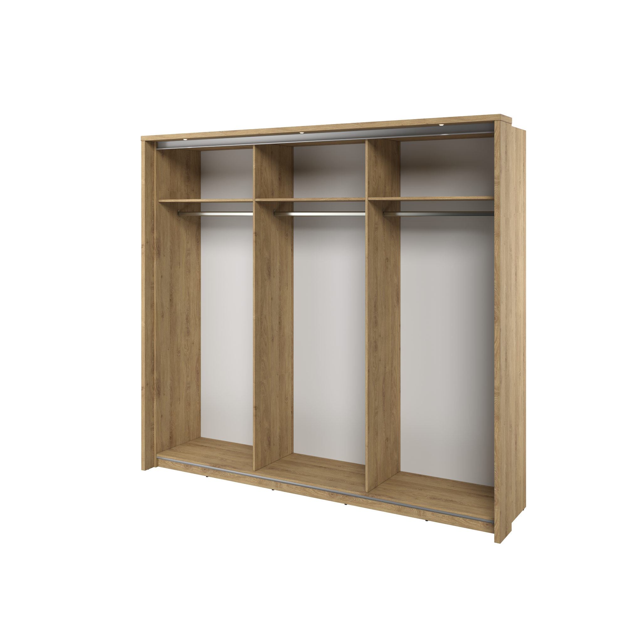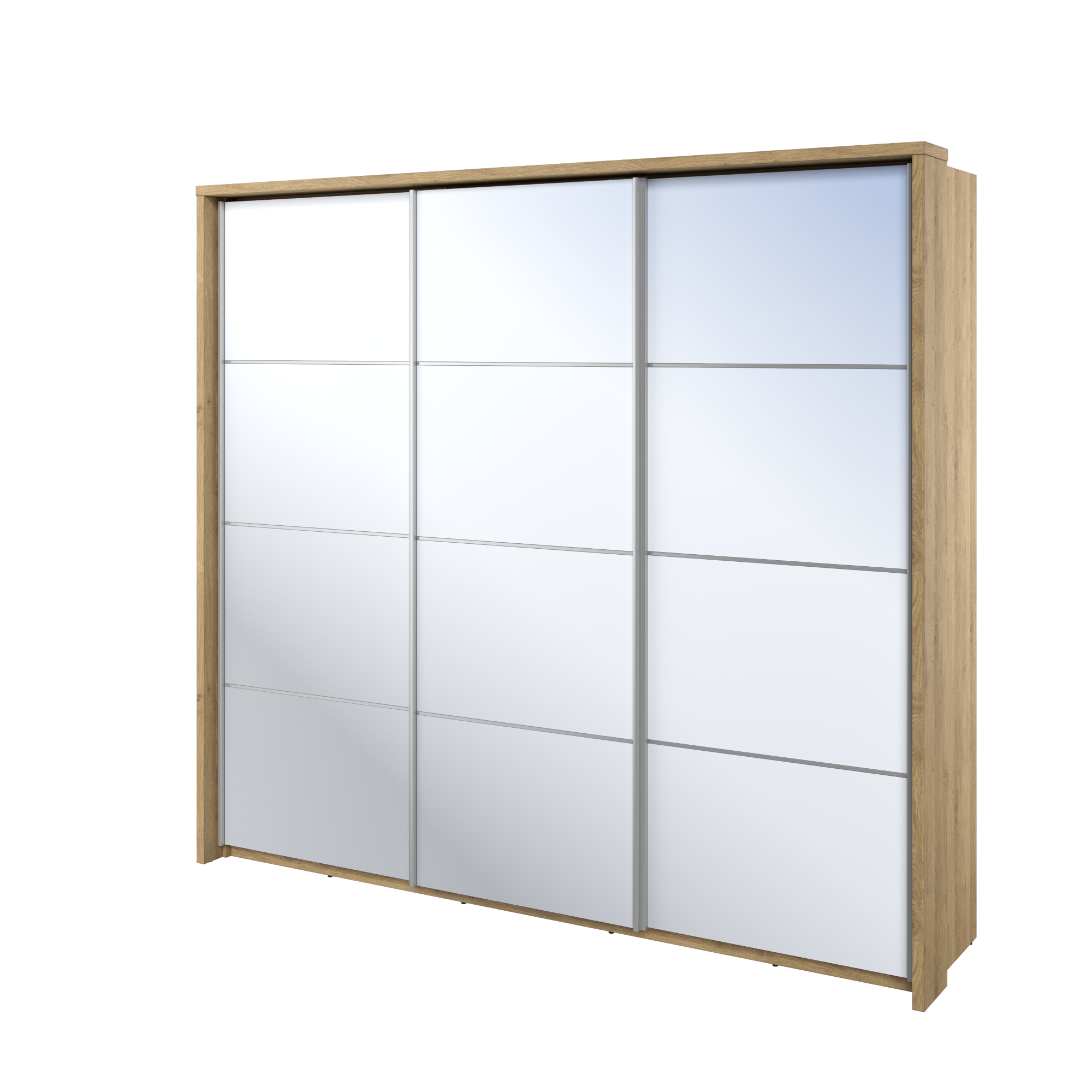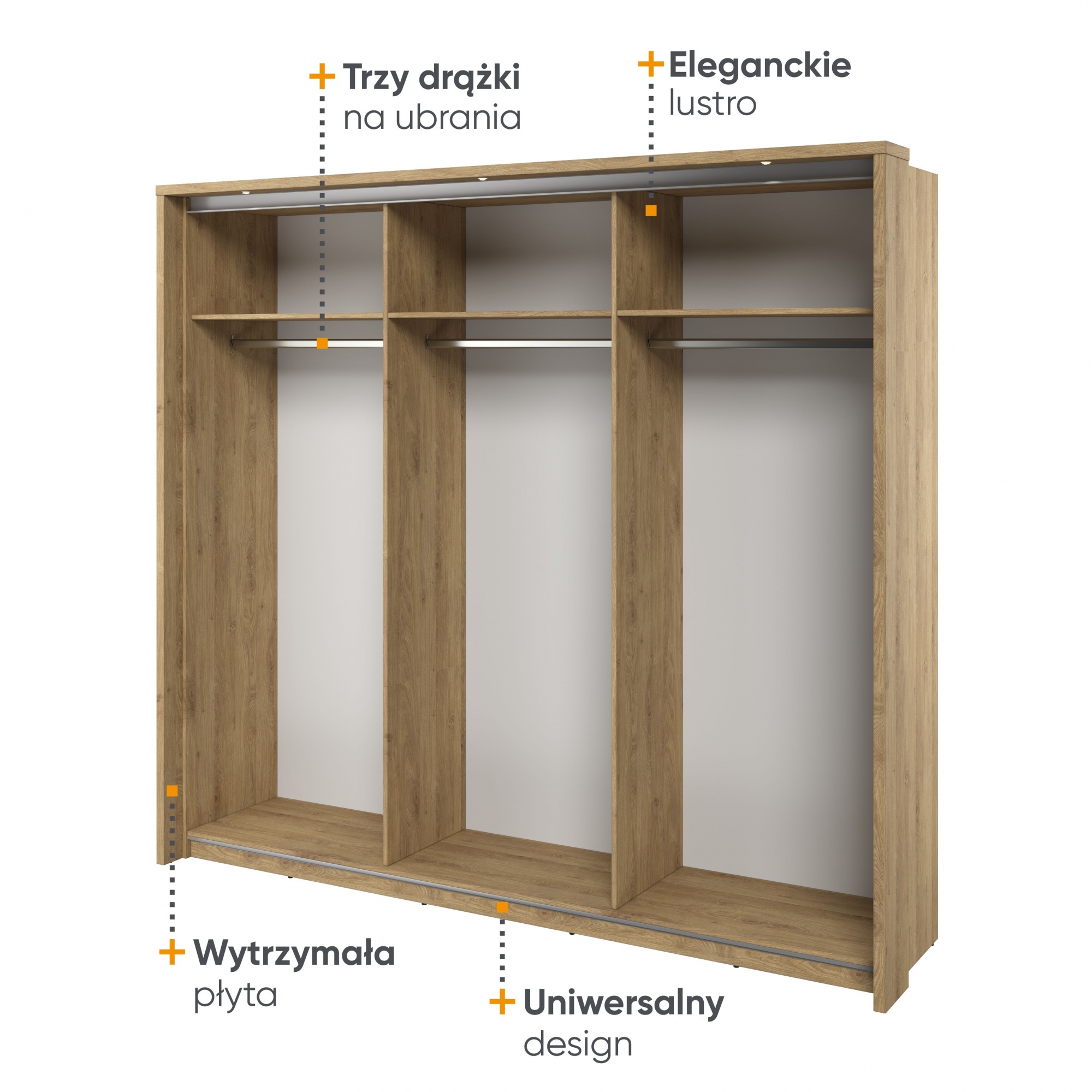 - Wykonanie : płyta laminowana o grubości 16mm, wykończona trwałym obrzeżem ABS. - Wybarwienie : Dąb shetland. - Prowadnica frontu szafy - aluminiowa (montaż dolny i górny). - Lustro ( x 3). - Metalowy drążek na ubrania ( x 3). - Waga: 229 kg - Maksymalne obciążenie : półek - 5 kg. |