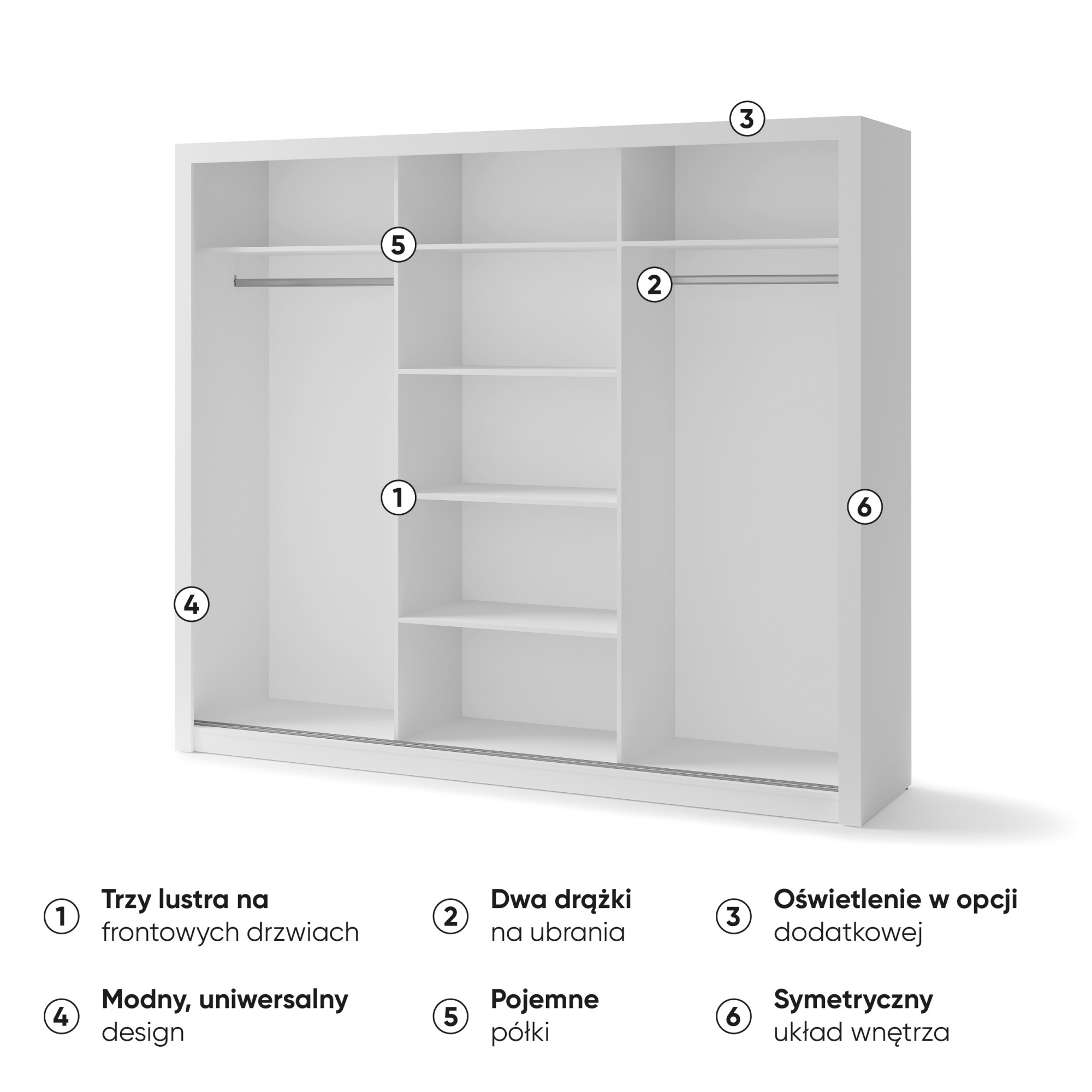 Szafa to niezbędny element wyposażenia w każdym domu, zaprojektowany z myślą o praktycznym przechowywaniu ubrań i akcesoriów. Pojemna szafa z kolekcji JADIA z pewnością spełni oczekiwania osób, poszukujących funkcjonalnego mebla o atrakcyjnym designie. Przemyślana konstrukcja i przestrzeń z powodzeniem pomieści wszystko, co niezbędne, pozwalając zachować porządek. Minimalistyczny wygląd, oraz uniwersalne wybarwienia szaf JADIA sprawią, że znakomicie dopełnią one każde wnętrze urządzone zarówno w nowoczesnym, jak i klasycznym stylu. Pojemna, obszerna szafa z trojgiem drzwi przesuwnych i lustrami optycznie powiększającymi wnętrze. Wyposażona w dwa drążki na wieszaki oraz obszerne półki. Mebel wykonano z wytrzymałej płyty laminowanej wykończonej trwałym obrzeżem ABS. Funkcjonalność, połączona z estetyką i solidnym wykonaniem, sprawia, że jest to nie tylko praktyczny, ale również atrakcyjny mebel, który tworzy przyjemne i uporządkowane wnętrza . Kolekcja JADIA oferuje szafy w różnych wzorach, kolorach, oraz rozmaitym wyposażeniu. Znajdź wśród nich szafę dopasowaną do Twoich potrzeb. Meble z kolekcji JADIA w dostępne w osobnych ofertach. |