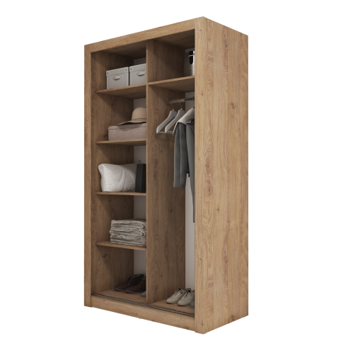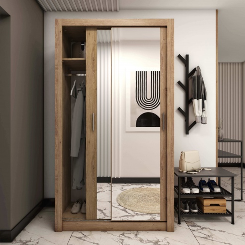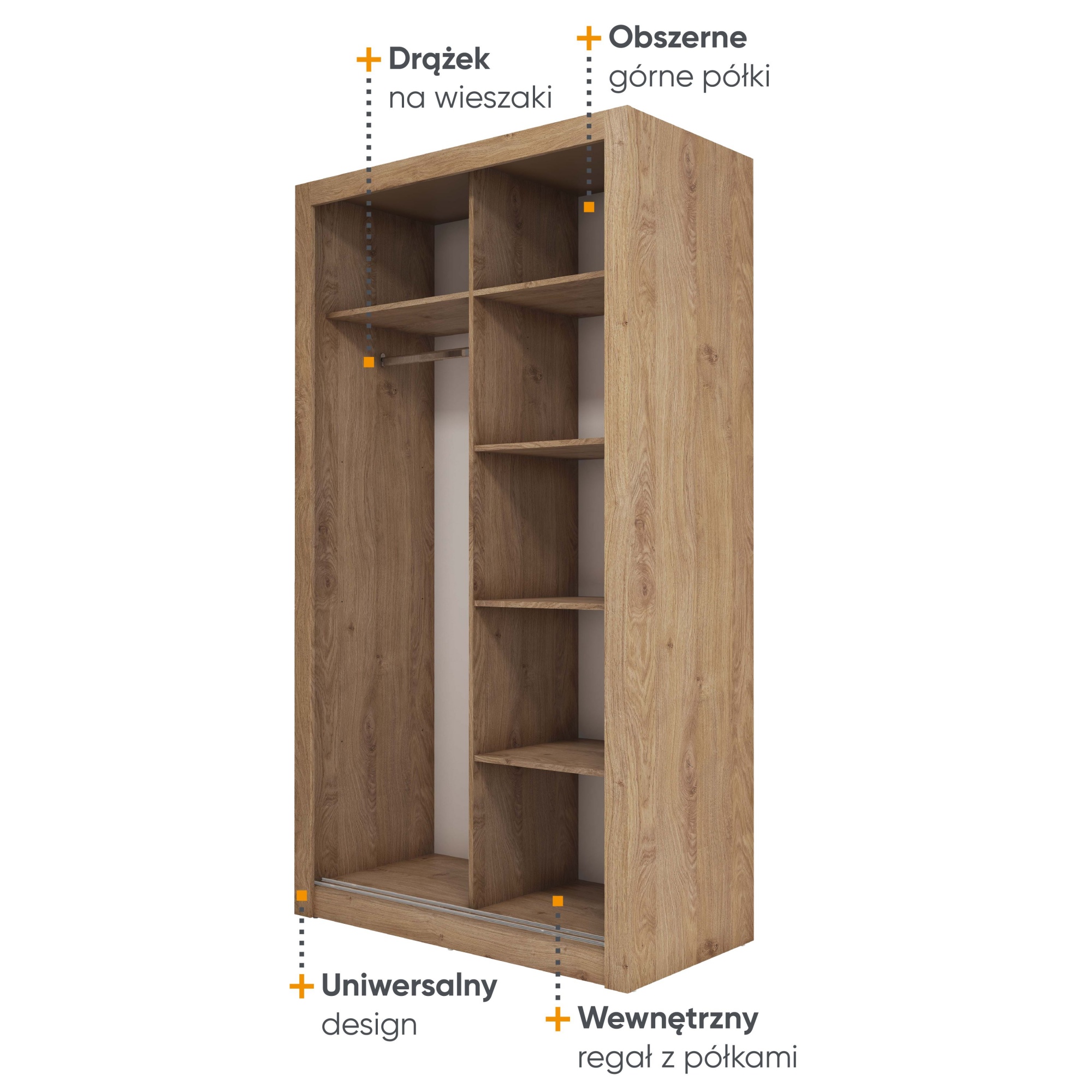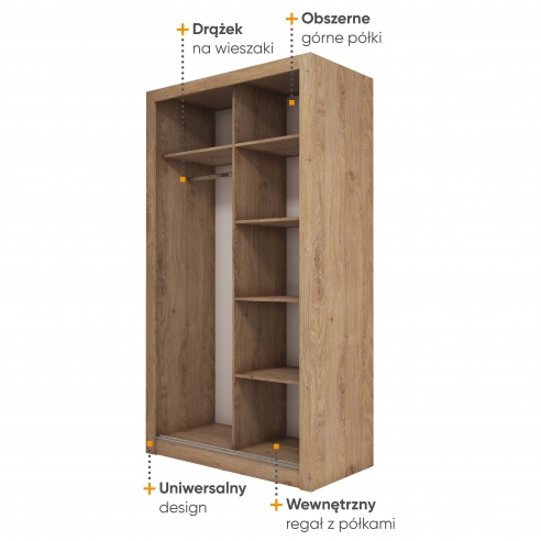 Szafa to niezbędny element wyposażenia w każdym domu, zaprojektowany z myślą o praktycznym przechowywaniu ubrań i akcesoriów. Pojemna szafa z kolekcji JADIA z pewnością spełni oczekiwania osób, poszukujących funkcjonalnego mebla o atrakcyjnym designie. Przemyślana konstrukcja i przestrzeń z powodzeniem pomieści wszystko, co niezbędne, pozwalając zachować porządek. Minimalistyczny wygląd, oraz uniwersalne wybarwienia szaf JADIA sprawią, że znakomicie dopełnią one każde wnętrze urządzone zarówno w nowoczesnym, jak i klasycznym stylu. Niewielka szafa JADIA z dwojgiem drzwi przesuwnych, które świetnie oszczędzają przestrzeń. Idealna do sypialni, garderoby, przedpokoju lub pokoju nastolatki/nastolatka. Modny, a jednocześnie uniwersalny design to zasługa prostej formy. Uzupełnieniem jest duże lustro na obu frontach, które optycznie powiększa przestrzeń i pozytywnie wpływa na komfort korzystania z szafy. Wnętrze szafy kryje drążek na wieszaki oraz wewnętrzy regał z pojemnymi półkami. Na obszernych, górnych półkach z powodzeniem zmieszczą się rzadziej używane rzeczy lub walizki. Funkcjonalność, połączona z estetyką i solidnym wykonaniem, sprawia, że jest to nie tylko praktyczny, ale również atrakcyjny mebel, który tworzy przyjemne i uporządkowane wnętrza. Kolekcja JADIA oferuje szafy w różnych wzorach, kolorach, oraz rozmaitym wyposażeniu. Znajdź wśród nich szafę dopasowaną do Twoich potrzeb. Meble z kolekcji JADIA w dostępne w osobnych ofertach.