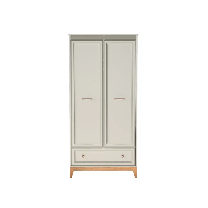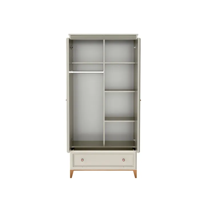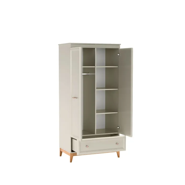 Obudowa Szafa DUBAI 10 jest wynikiem dwudrzwiowej konstrukcji, która zapewnia duży obszar do przechowania ubrań, a dodatkowa półka nad drążkiem na wieszaki ułatwi segregację oraz codzienne korzystanie. Z kolei, niewielka, ale dobrze zlokalizowana szuflada w dolnej części szafy służy idealnie do przechowywania drobnych akcesoriów.