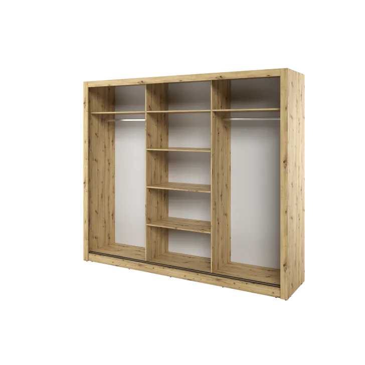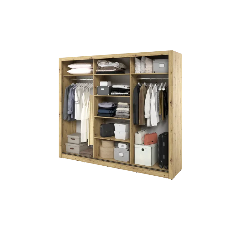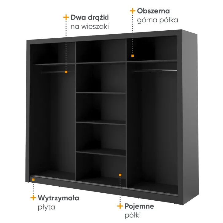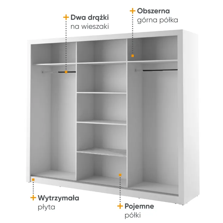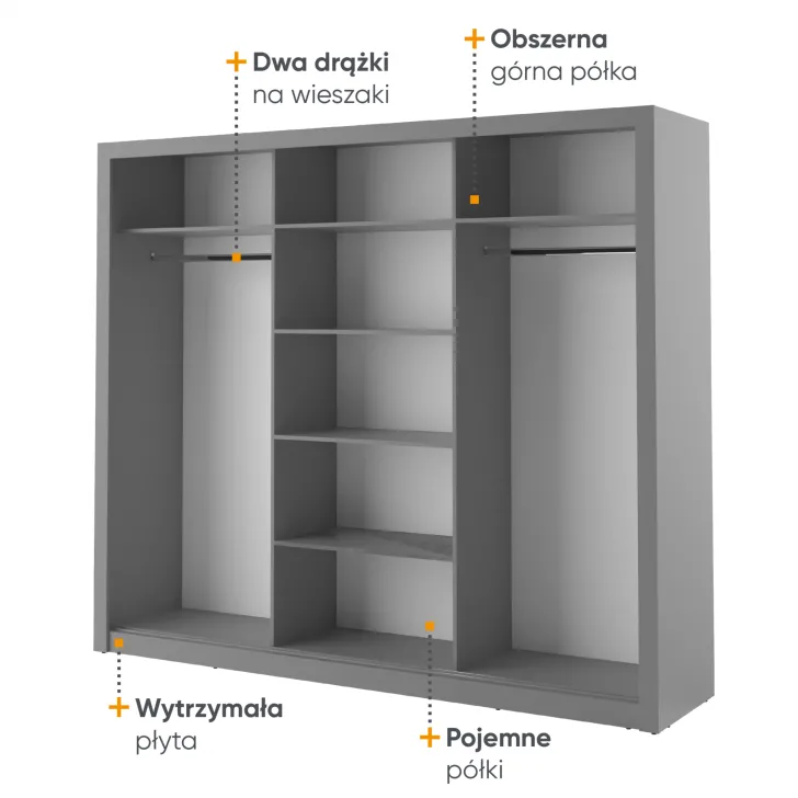 Wewnątrz szafy znajdują się dwa wygodne drążki na ubrania oraz kilka pojemnych półek. Dzięki temu każdy element garderoby znajdzie tutaj swoje miejsce. Dodatkowym atutem są otwory montażowe na tylnej i bocznych ściankach szafy, które umożliwiają bezpieczne przymocowanie mebla do ściany. Takie rozwiązanie zwiększa stabilność szafy, a także minimalizuje ryzyko jej przewrócenia.