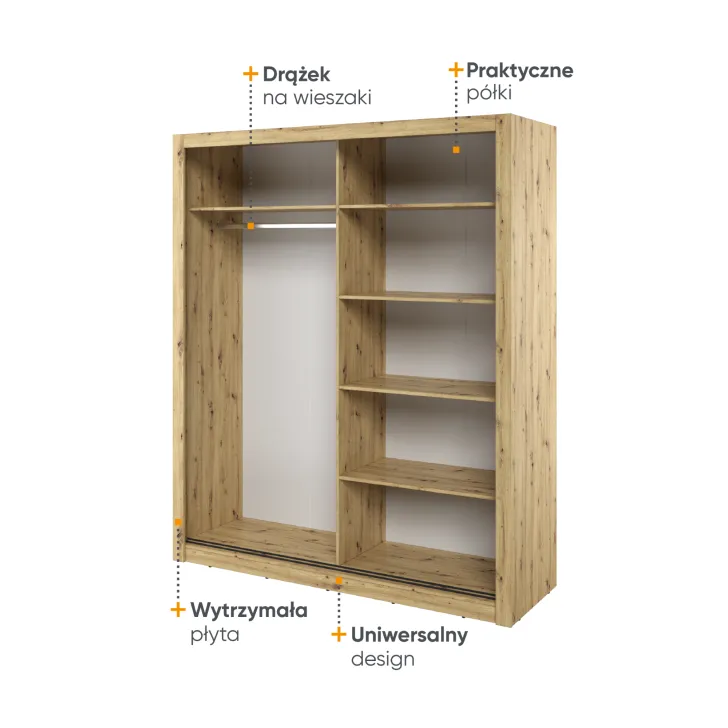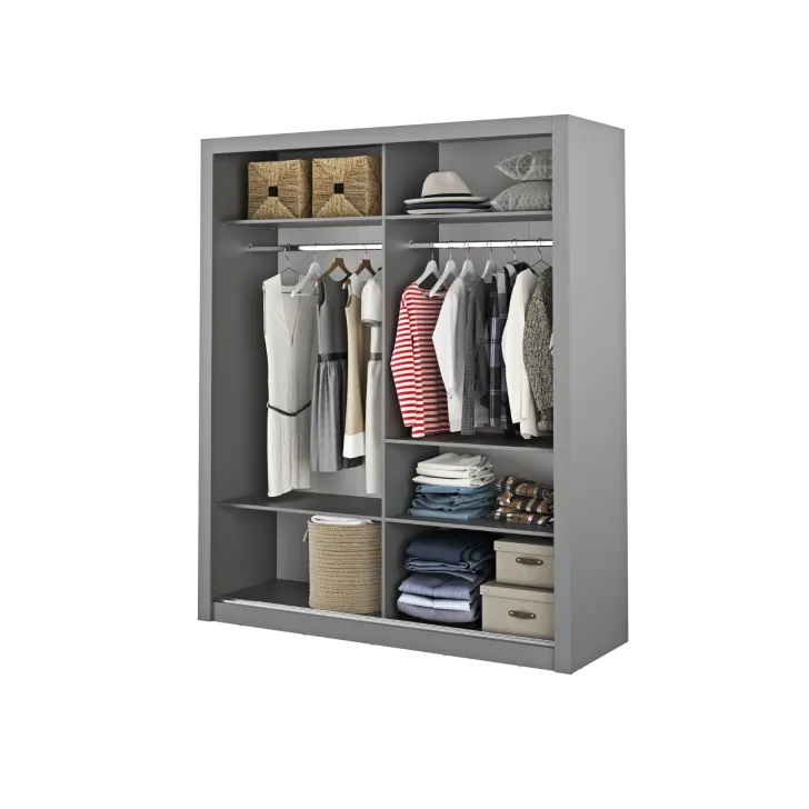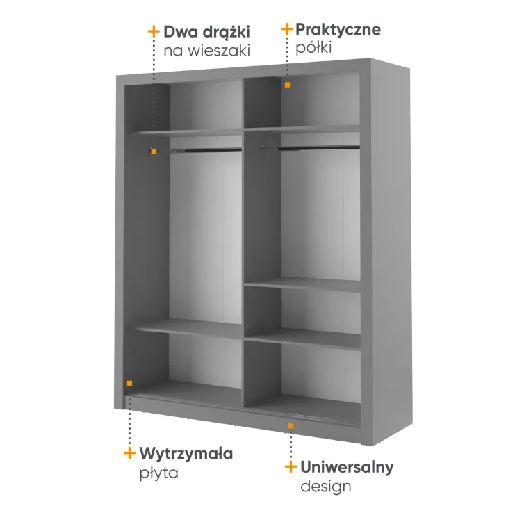 Szafa ERTA 3 posiada minimalistyczny wygląd oraz uniwersalne wybarwienia, sprawiające, że doskonale wpasuje się w każde wnętrze, niezależnie od stylu - zarówno nowoczesnego, jak i klasycznego. Szafka wyposażona jest w dwoje drzwi przesuwnych, które nie tylko ułatwiają dostęp do wnętrza, ale również pozwalają na optymalne wykorzystanie przestrzeni.